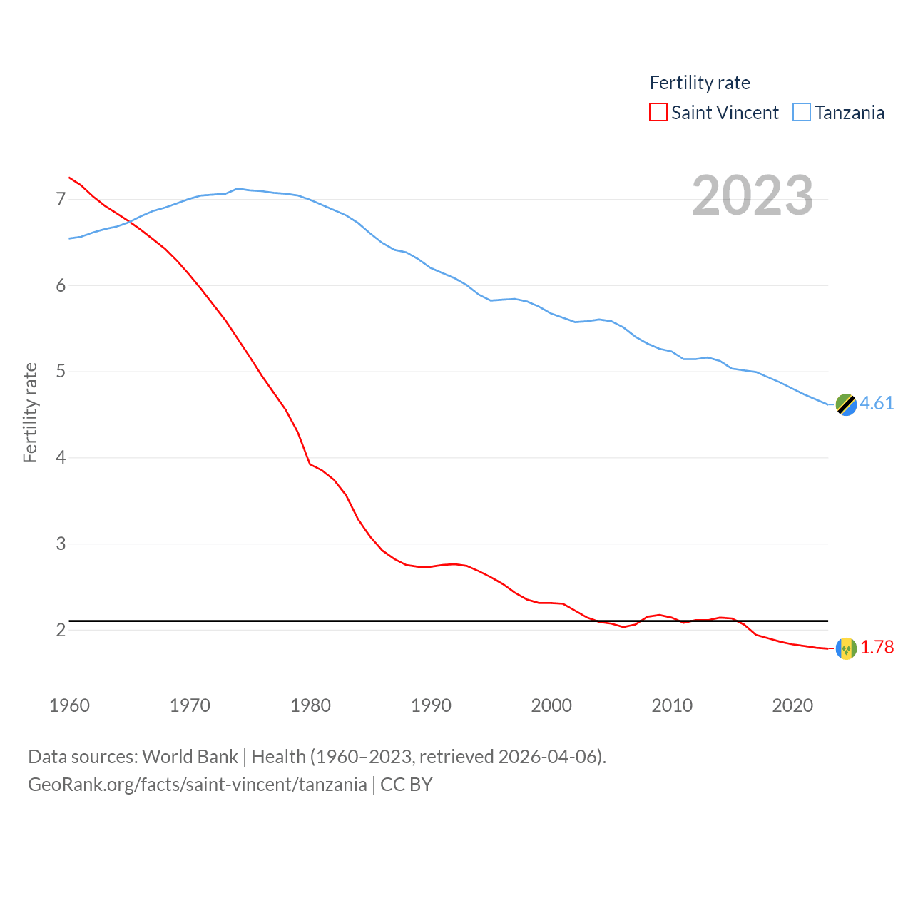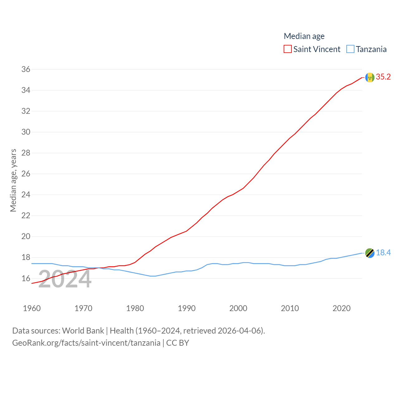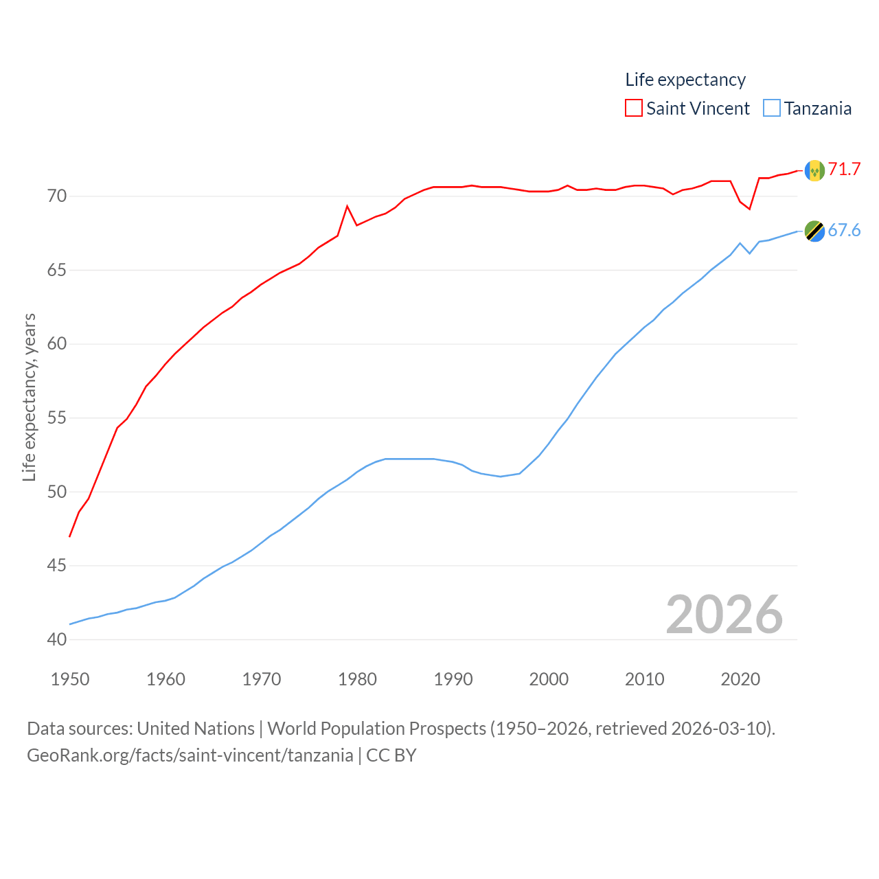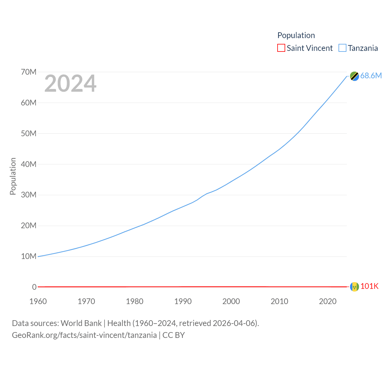 Saint Vincent has a population of 101K (ranked 184/197), compared with 68.6M in Tanzania (ranked 22/197). Saint Vincent's land area is 150.6 sq mi versus 342,009 sq mi for Tanzania (ranked 185th vs. 31st).
