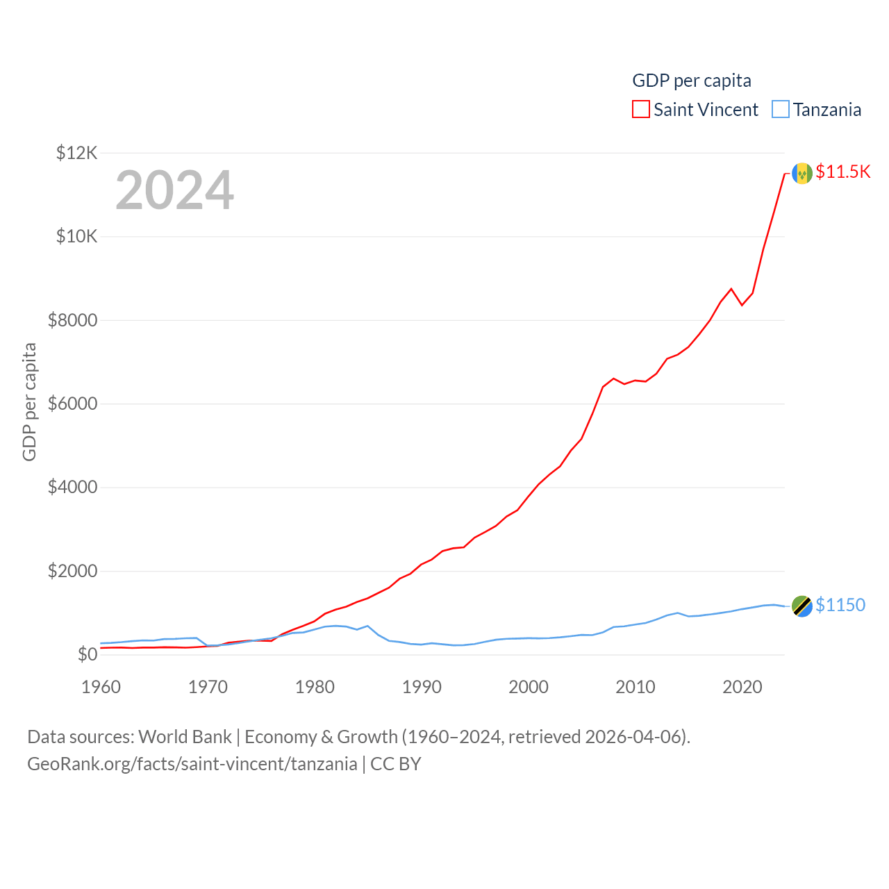 By GDP, Saint Vincent ranks 186/197 ($1.16B) and Tanzania ranks 82/197 ($78.8B). By GDP per capita, Saint Vincent ranks 81/197 ($11,501), while Tanzania ranks 170/197 ($1,150).