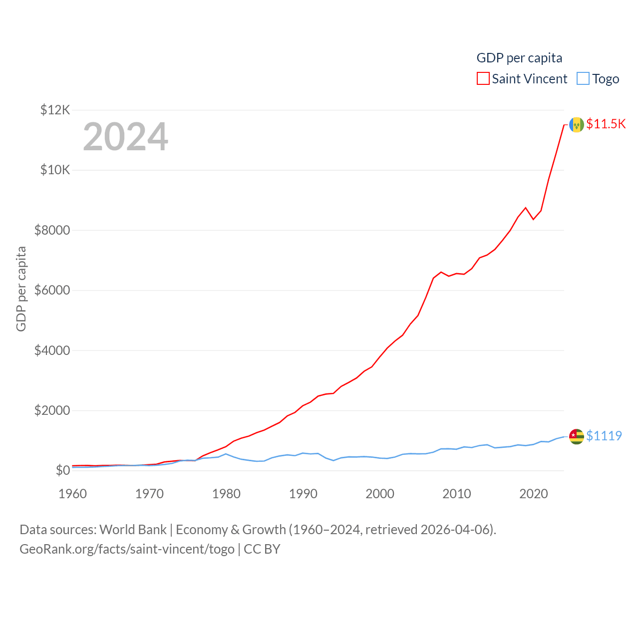 By GDP, Saint Vincent ranks 186/197 ($1.16B) and Togo ranks 154/197 ($10.7B). By GDP per capita, Saint Vincent ranks 81/197 ($11,501), while Togo ranks 172/197 ($1,119).
