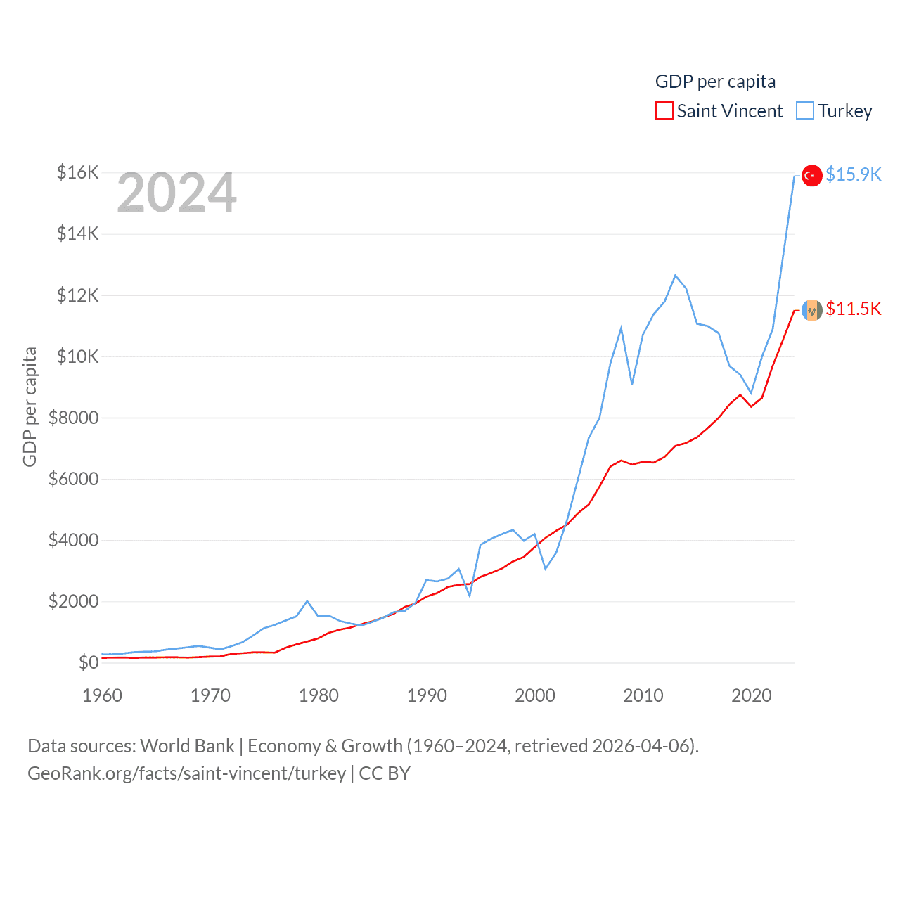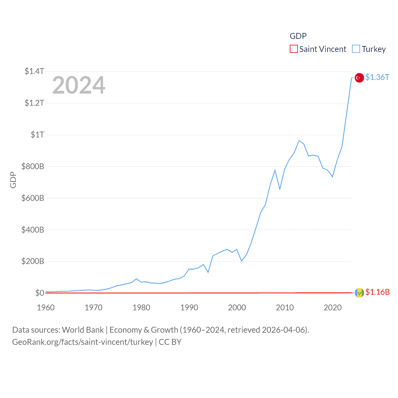 By GDP, Saint Vincent ranks 186/197 ($1.16B) and Turkey ranks 17/197 ($1.36T). By GDP per capita, Saint Vincent ranks 81/197 ($11,501), while Turkey ranks 66/197 ($15,893).