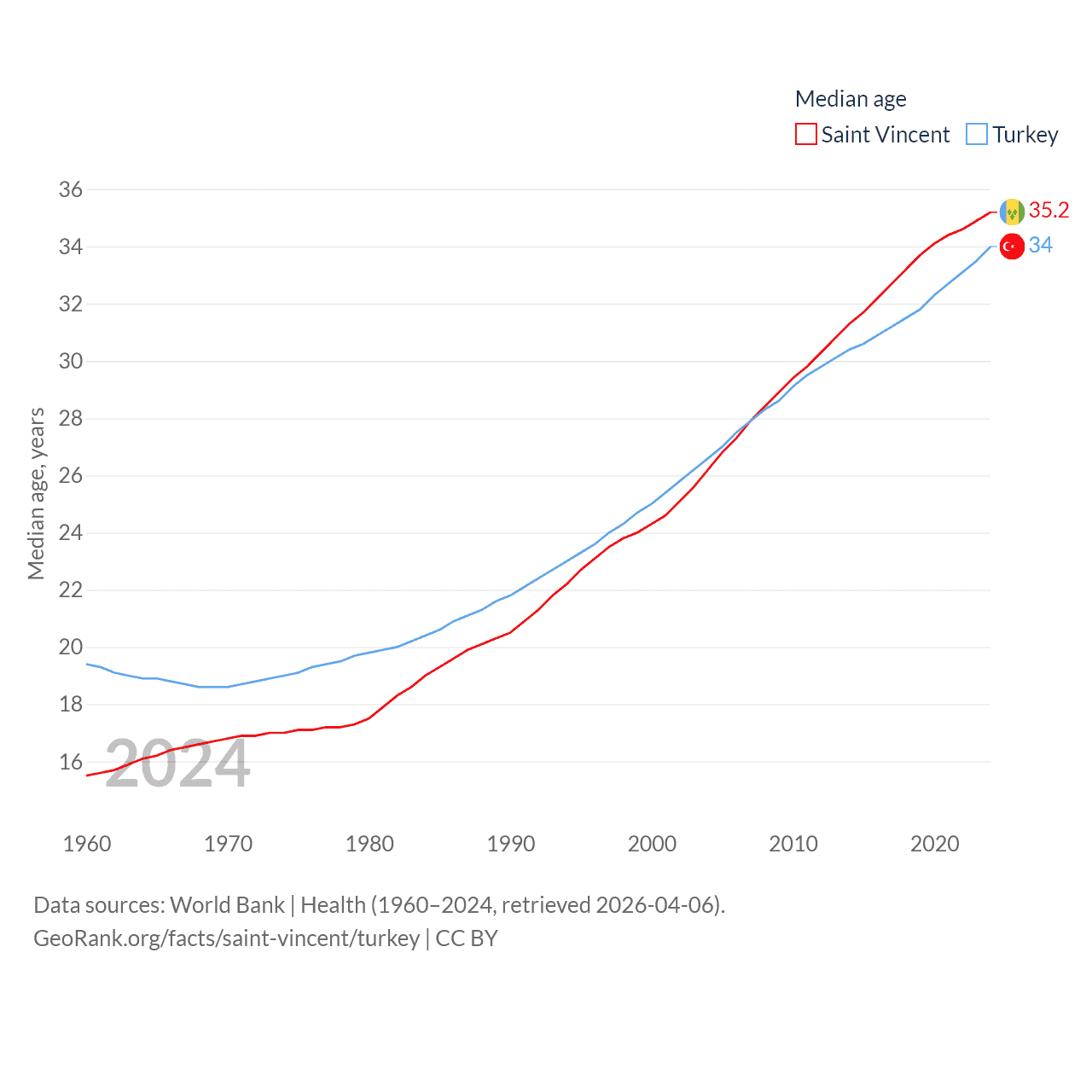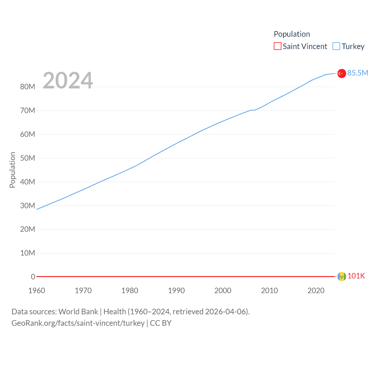 Saint Vincent has a population of 101K (ranked 184/197), compared with 85.5M in Turkey (ranked 18/197). Saint Vincent's land area is 150.6 sq mi versus 297,156 sq mi for Turkey (ranked 185th vs. 36th).