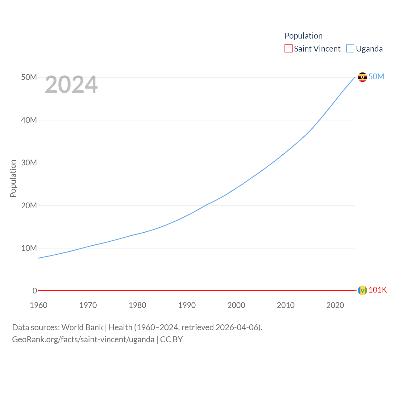 Saint Vincent has a population of 101K (ranked 184/197), compared with 50M in Uganda (ranked 31/197). Saint Vincent's land area is 150.6 sq mi versus 77,421 sq mi for Uganda (ranked 185th vs. 84th).