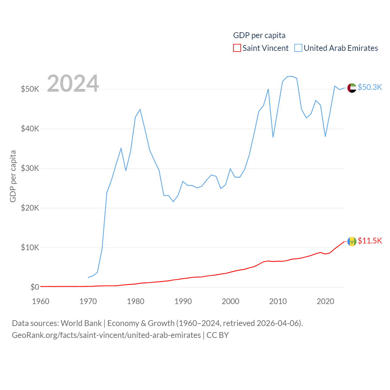 By GDP, Saint Vincent ranks 186/197 ($1.16B) and The United Arab Emirates ranks 27/197 ($552B). By GDP per capita, Saint Vincent ranks 81/197 ($11,501), while The United Arab Emirates ranks 24/197 ($50,274).