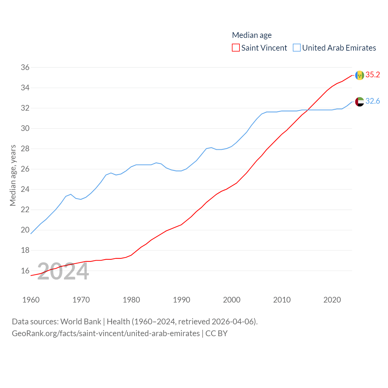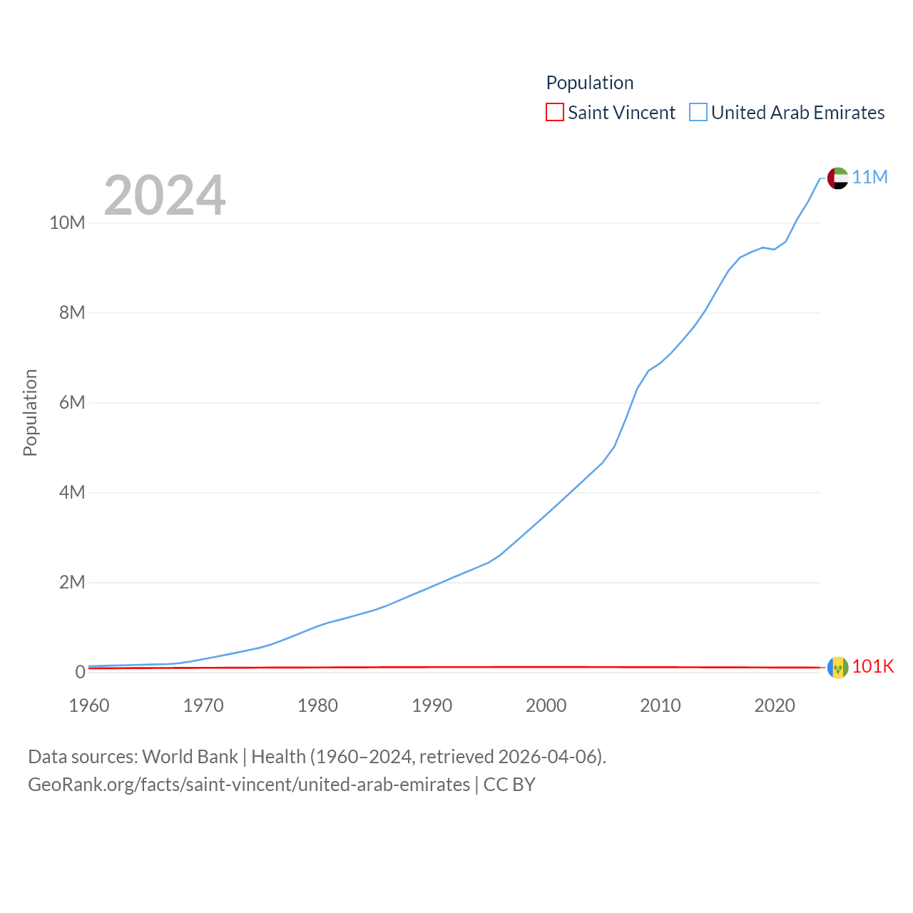 Saint Vincent has a population of 101K (ranked 184/197), compared with 11M in The United Arab Emirates (ranked 86/197). Saint Vincent's land area is 150.6 sq mi versus 27,421 sq mi for The United Arab Emirates (ranked 185th vs. 117th).