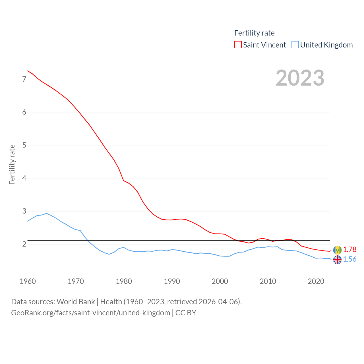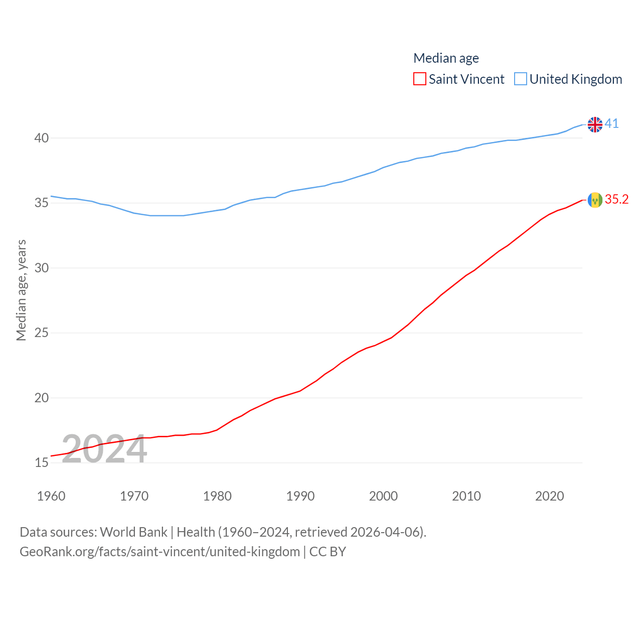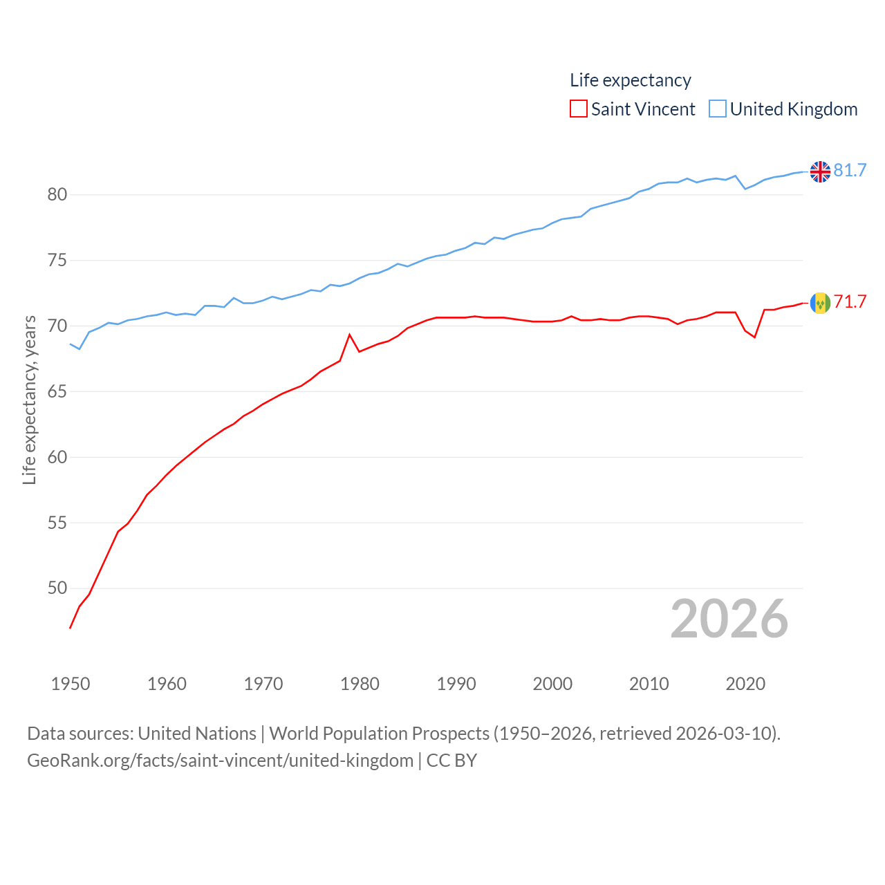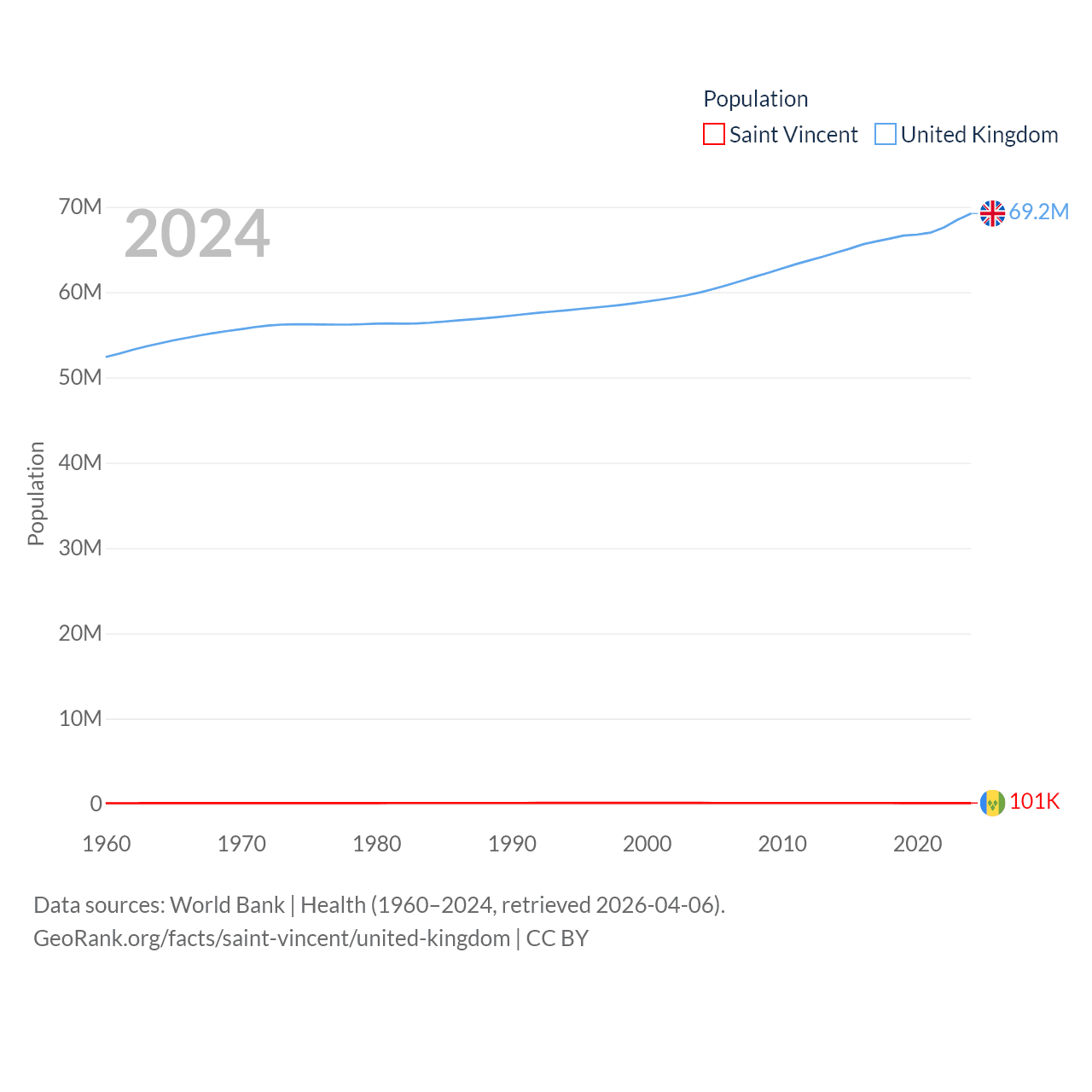 Saint Vincent has a population of 101K (ranked 184/197), compared with 69.2M in The United Kingdom (ranked 21/197). Saint Vincent's land area is 150.6 sq mi versus 93,410 sq mi for The United Kingdom (ranked 185th vs. 78th).