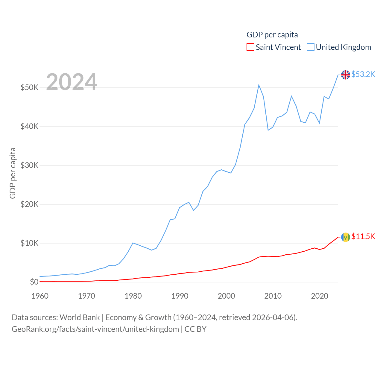 By GDP, Saint Vincent ranks 186/197 ($1.16B) and The United Kingdom ranks 6/197 ($3.69T). By GDP per capita, Saint Vincent ranks 81/197 ($11,501), while The United Kingdom ranks 22/197 ($53,246).