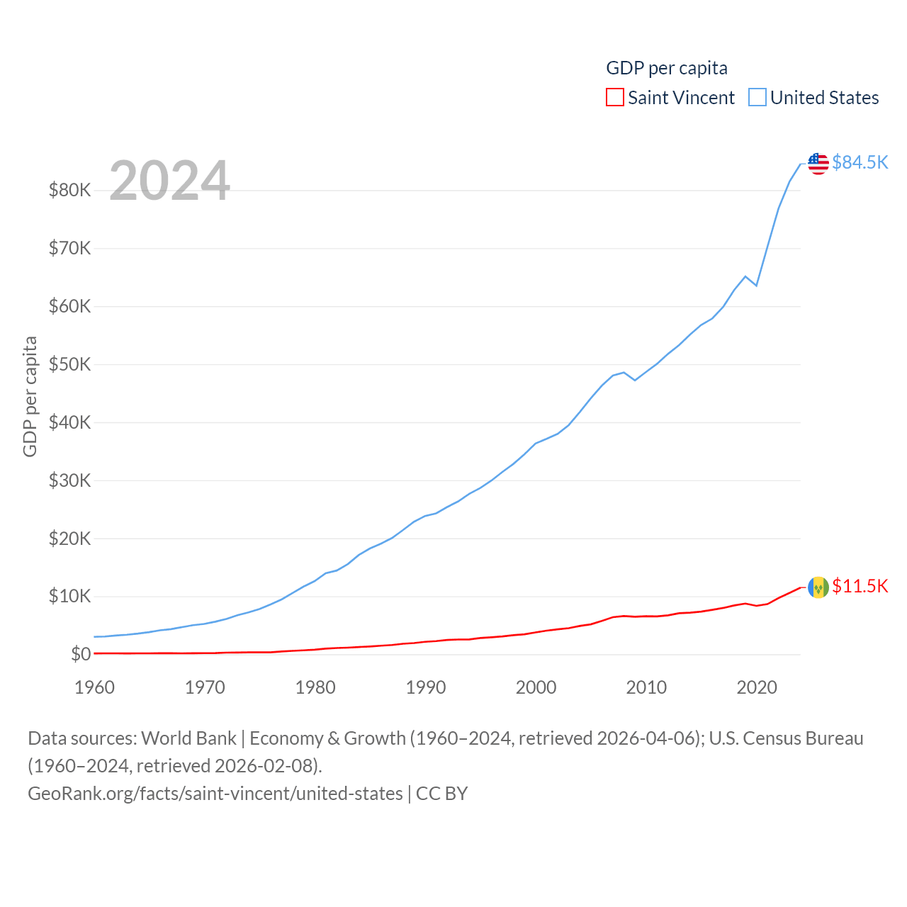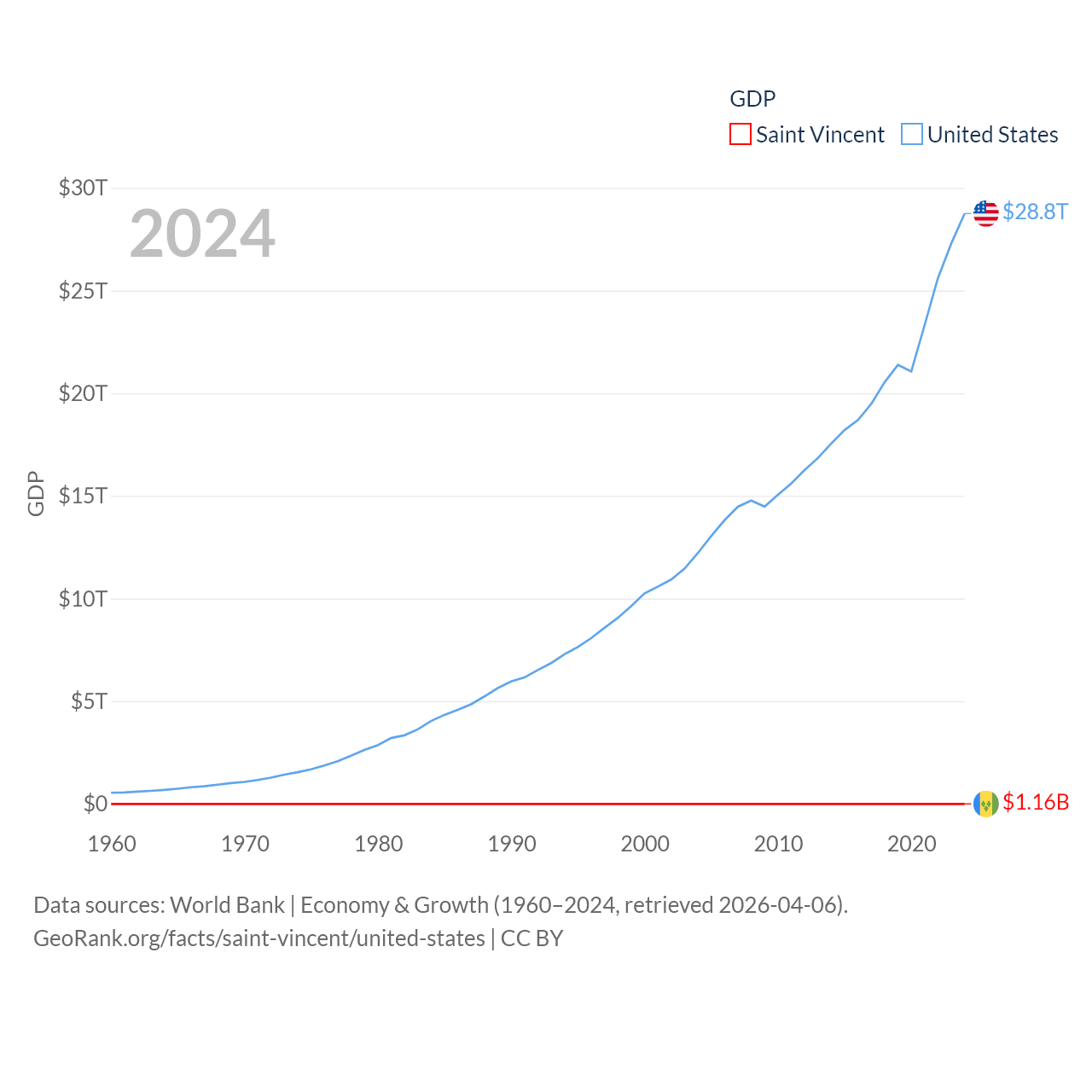 By GDP, Saint Vincent ranks 186/197 ($1.16B) and The United States ranks 1/197 ($28.8T). By GDP per capita, Saint Vincent ranks 81/197 ($11,501), while The United States ranks 10/197 ($84,534).