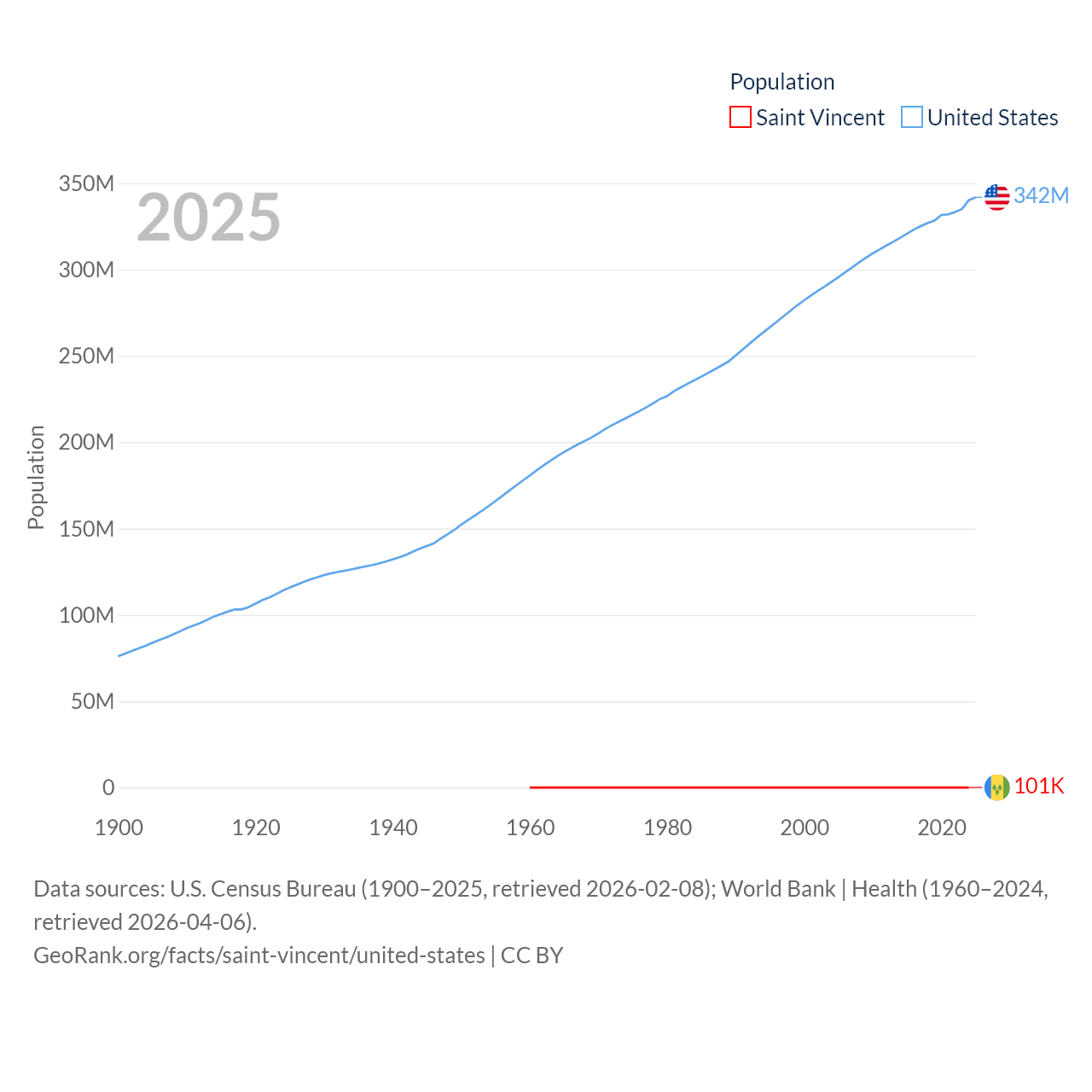 Saint Vincent has a population of 101K (ranked 184/197), compared with 342M in The United States (ranked 3/197). Saint Vincent's land area is 150.6 sq mi versus 3,531,839 sq mi for The United States (ranked 185th vs. 3rd).