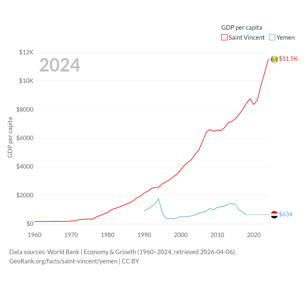 By GDP, Saint Vincent ranks 186/197 ($1.16B) and Yemen ranks 125/197 ($21.6B). By GDP per capita, Saint Vincent ranks 81/197 ($11,501), while Yemen ranks 191/197 ($634).