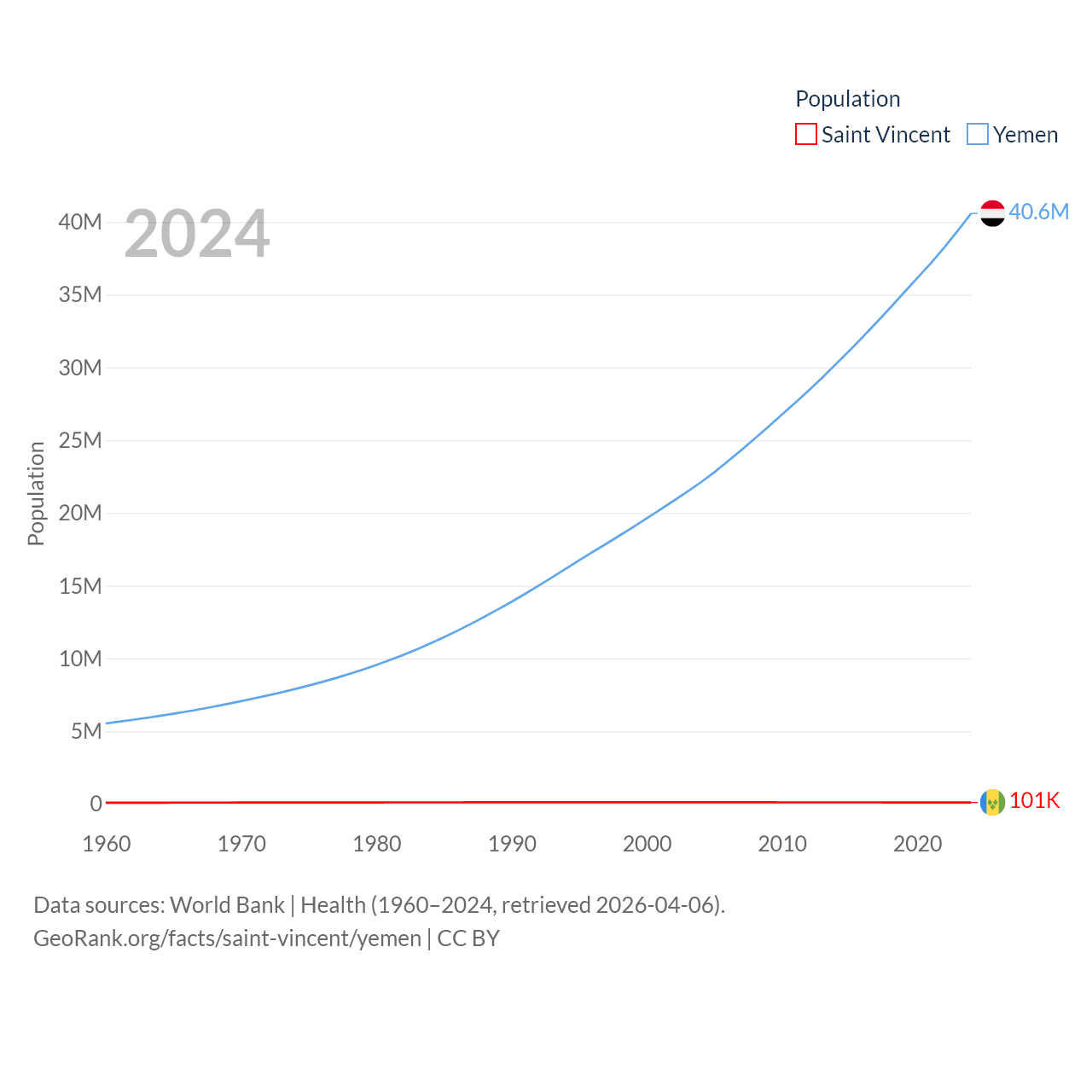 Saint Vincent has a population of 101K (ranked 184/197), compared with 40.6M in Yemen (ranked 38/197). Saint Vincent's land area is 150.6 sq mi versus 203,850 sq mi for Yemen (ranked 185th vs. 49th).