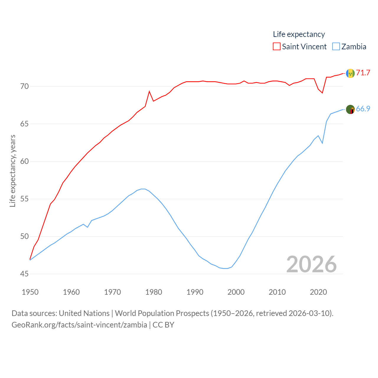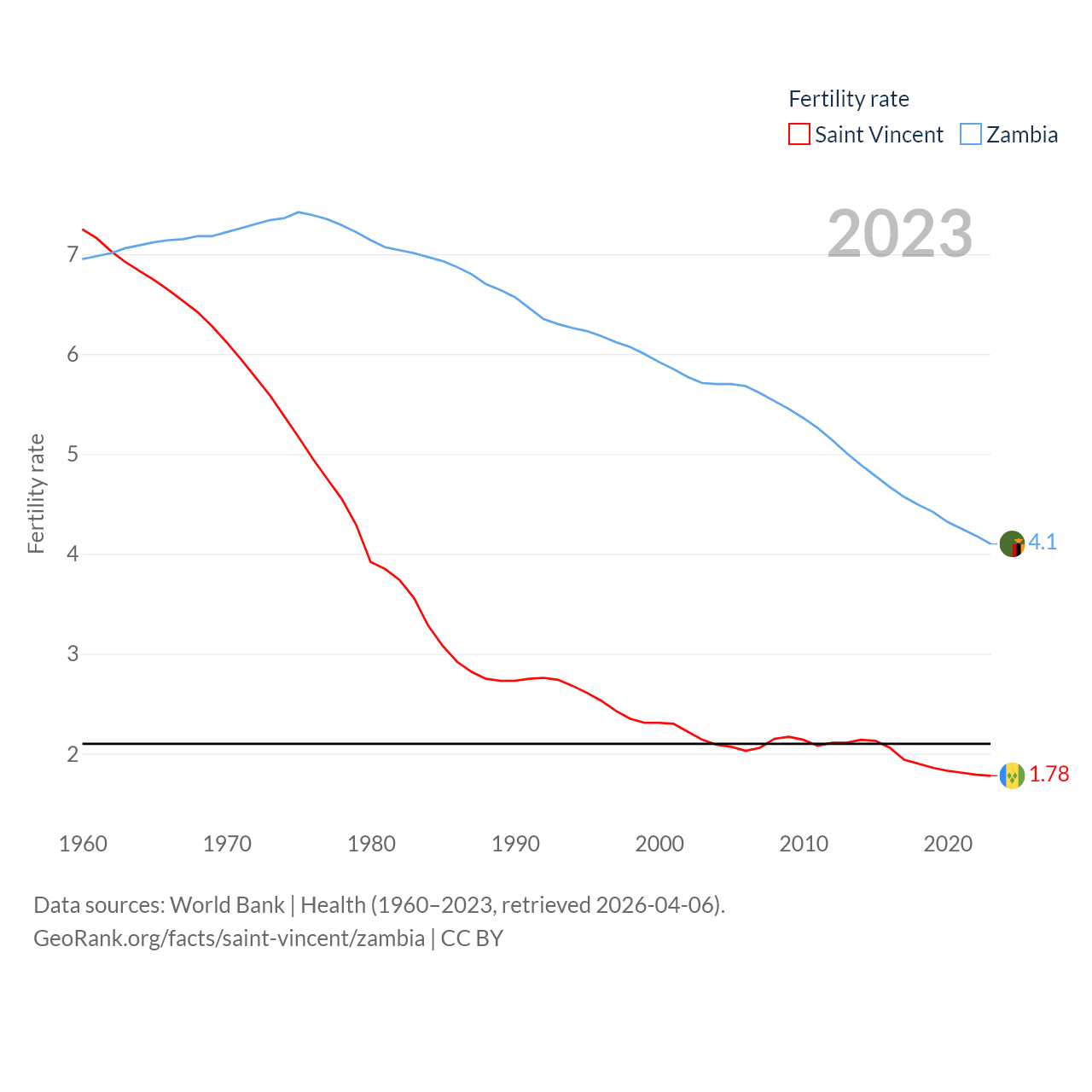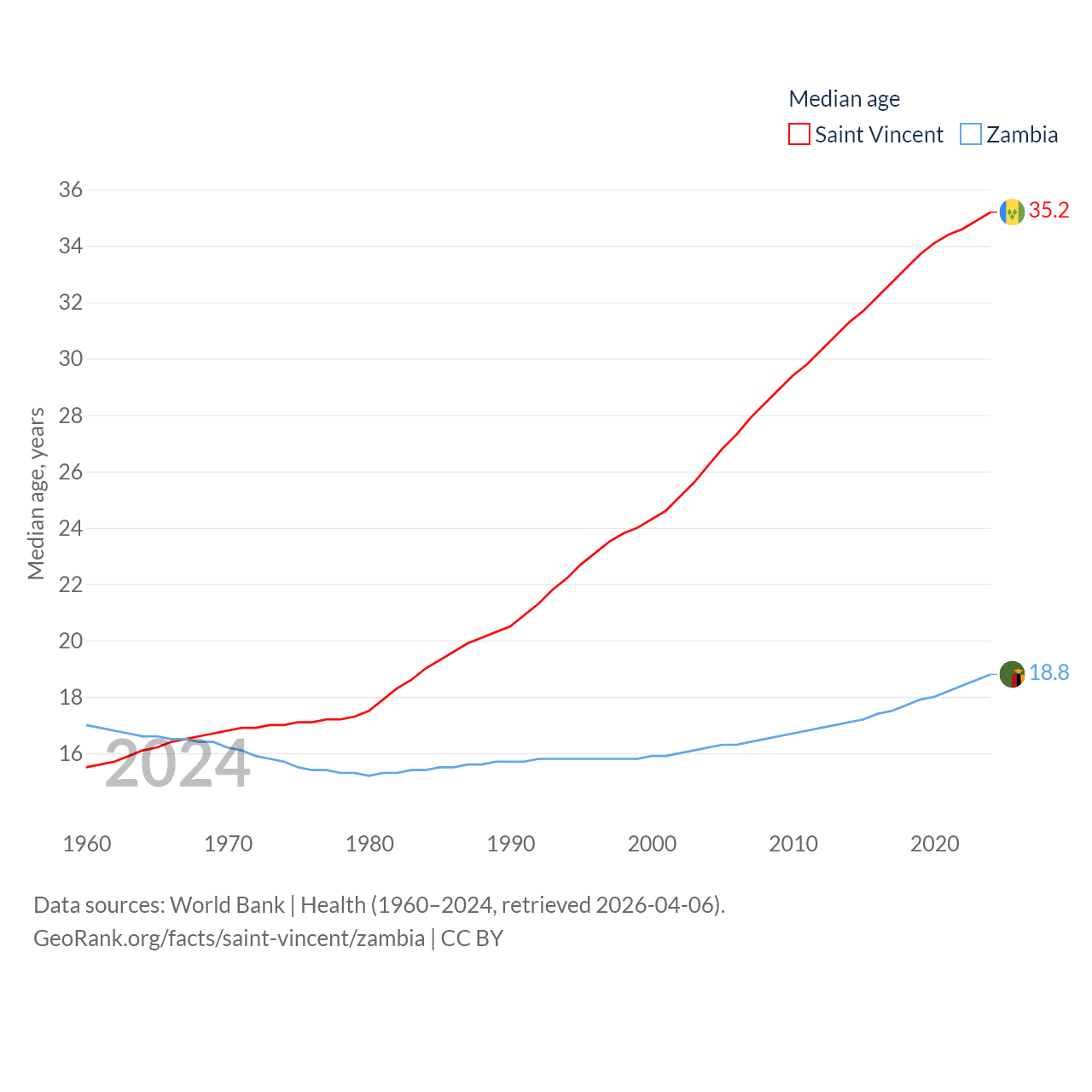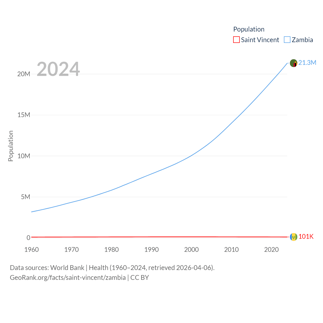 Saint Vincent has a population of 101K (ranked 184/197), compared with 21.3M in Zambia (ranked 63/197). Saint Vincent's land area is 150.6 sq mi versus 287,024 sq mi for Zambia (ranked 185th vs. 37th).