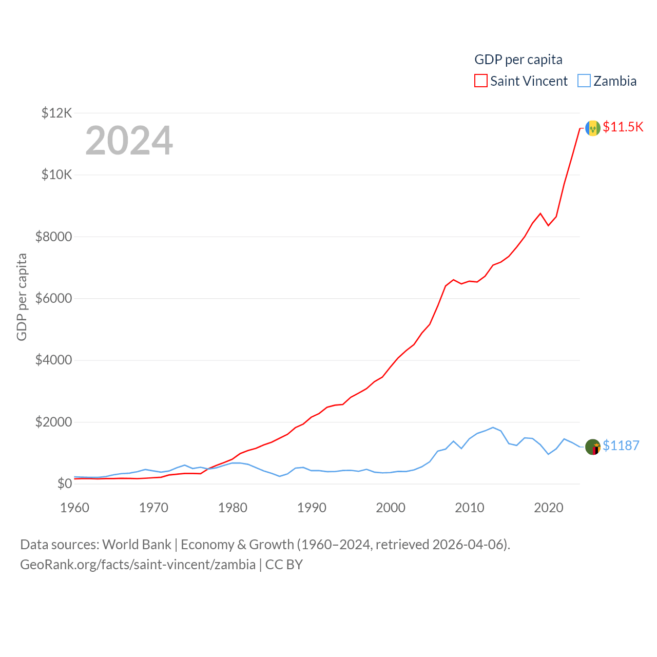 By GDP, Saint Vincent ranks 186/197 ($1.16B) and Zambia ranks 116/197 ($25.3B). By GDP per capita, Saint Vincent ranks 81/197 ($11,501), while Zambia ranks 169/197 ($1,187).