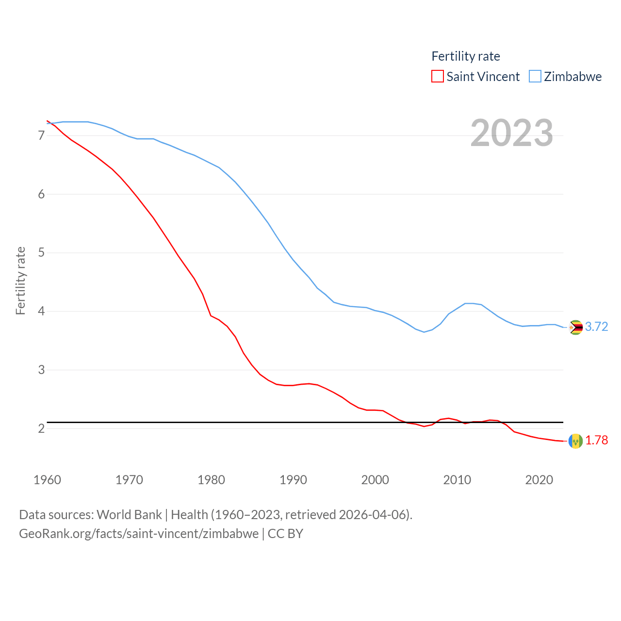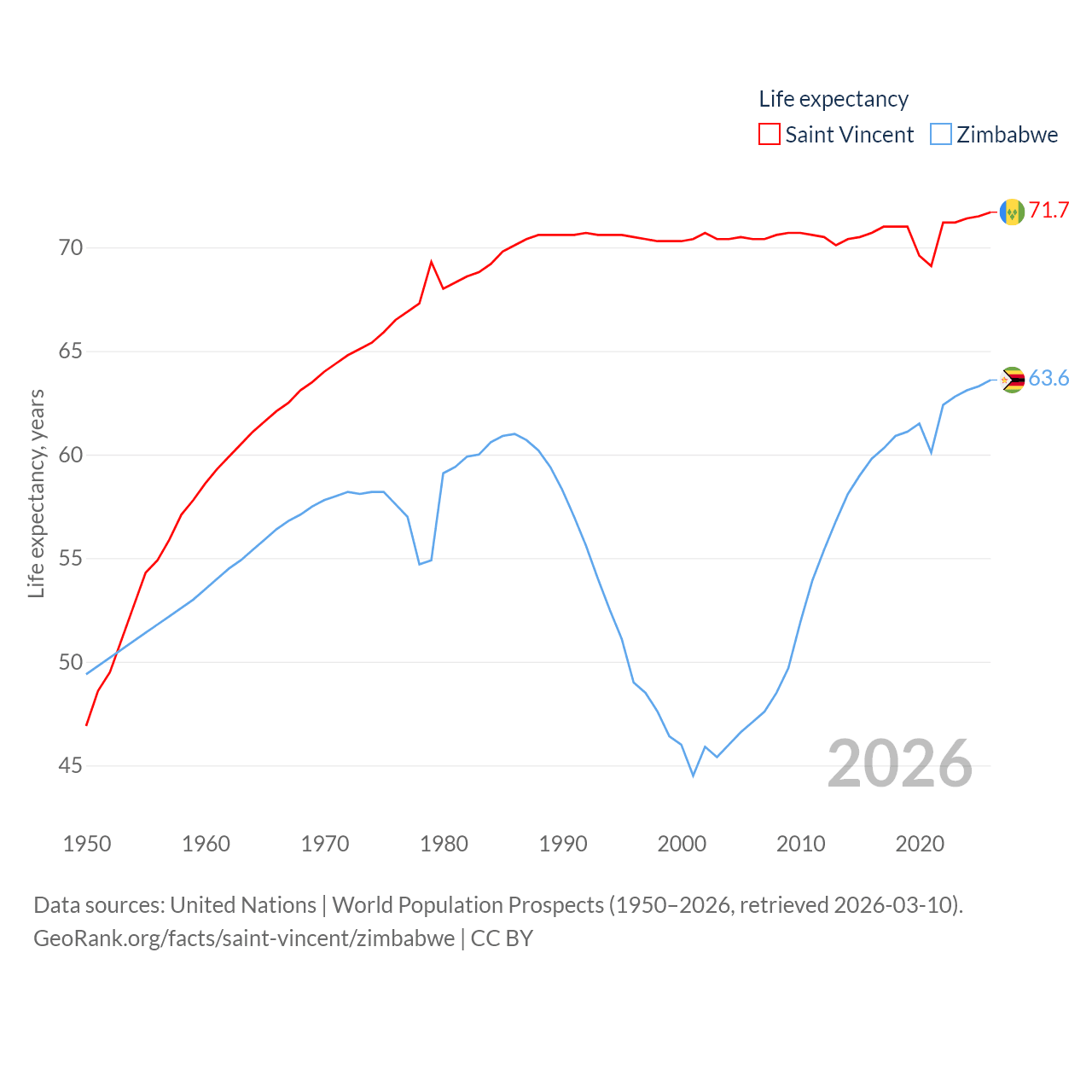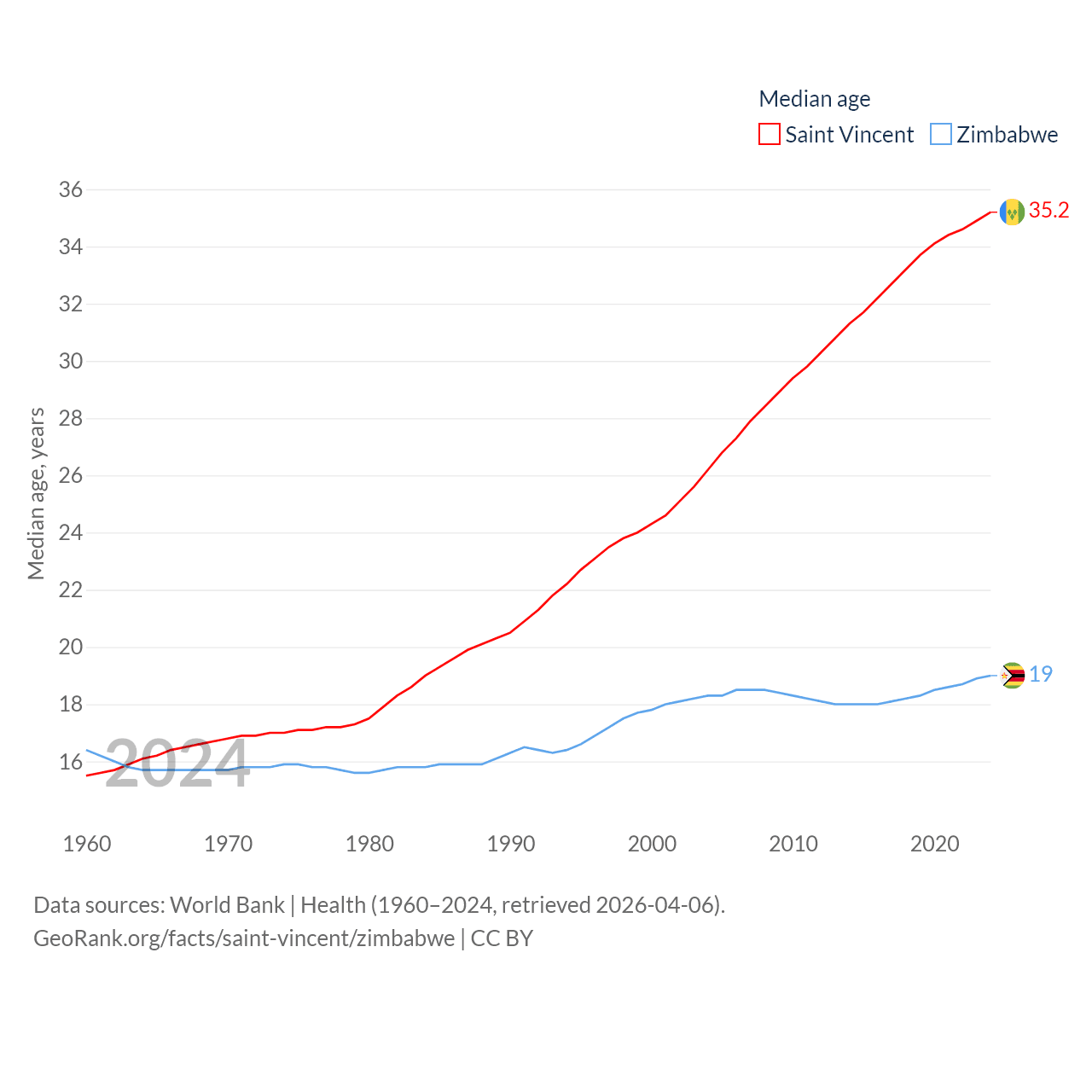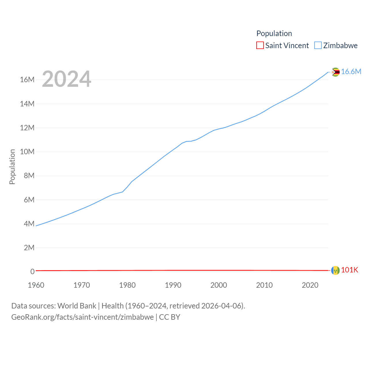 Saint Vincent has a population of 101K (ranked 184/197), compared with 16.6M in Zimbabwe (ranked 74/197). Saint Vincent's land area is 150.6 sq mi versus 149,364 sq mi for Zimbabwe (ranked 185th vs. 60th).