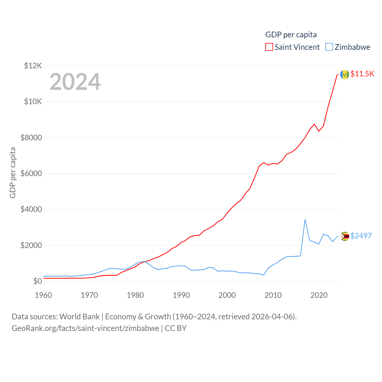 By GDP, Saint Vincent ranks 186/197 ($1.16B) and Zimbabwe ranks 102/197 ($41.5B). By GDP per capita, Saint Vincent ranks 81/197 ($11,501), while Zimbabwe ranks 148/197 ($2,497).