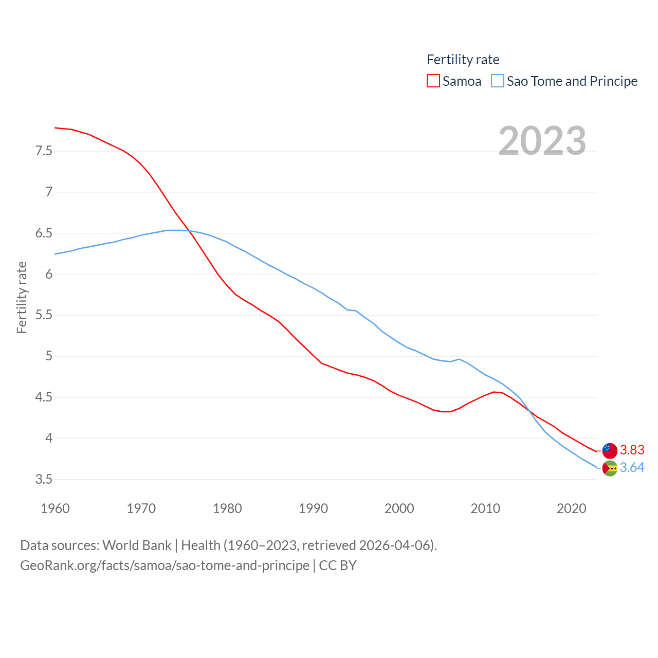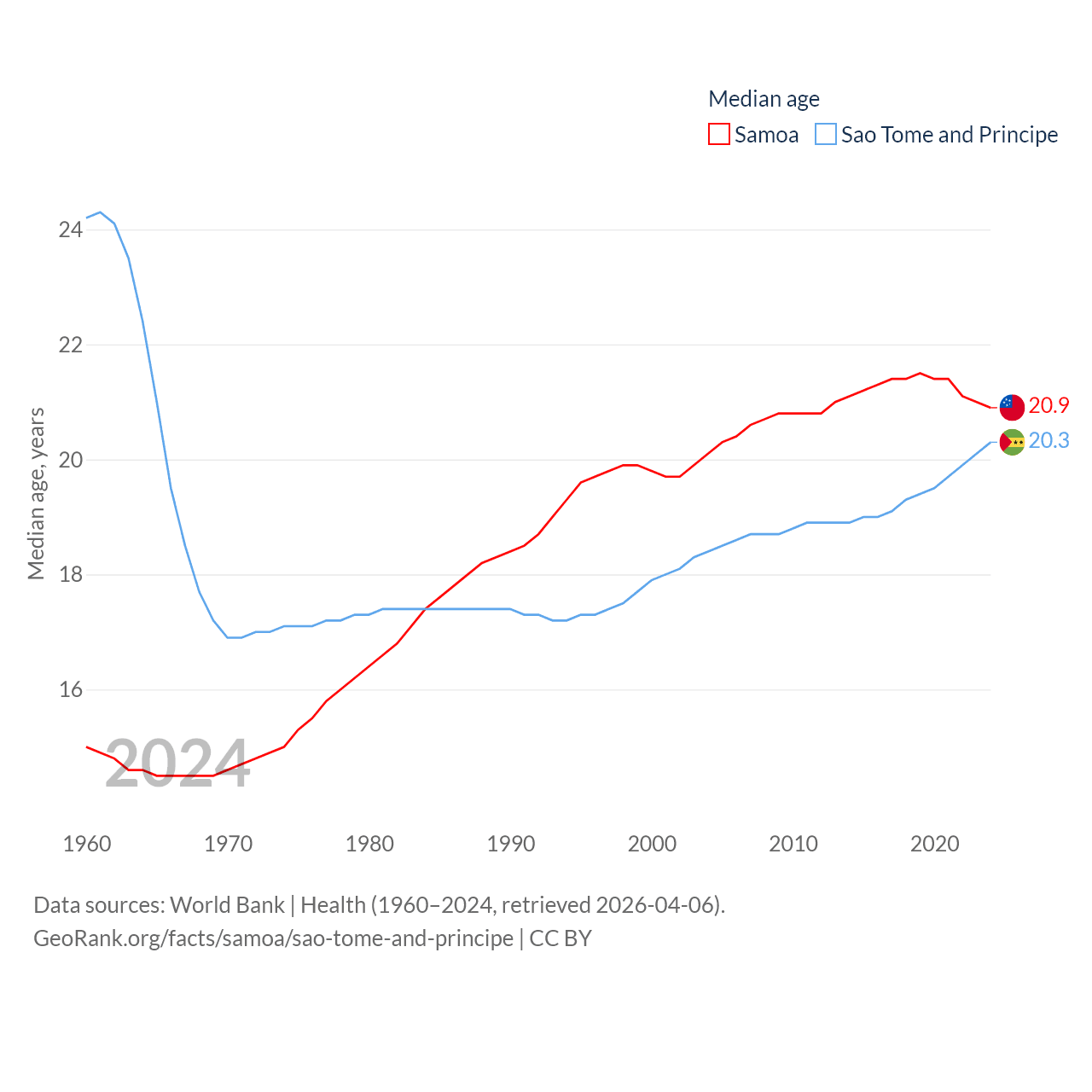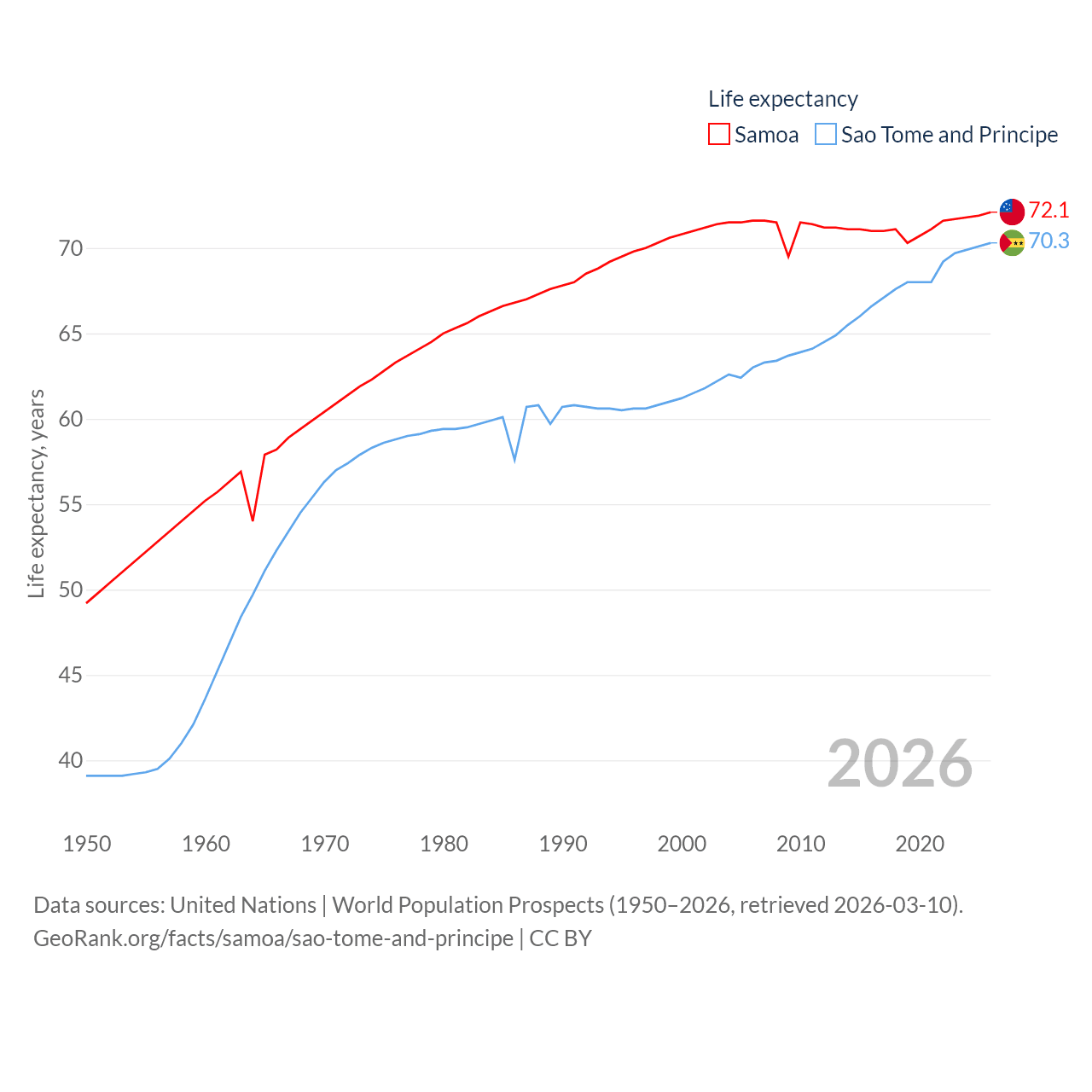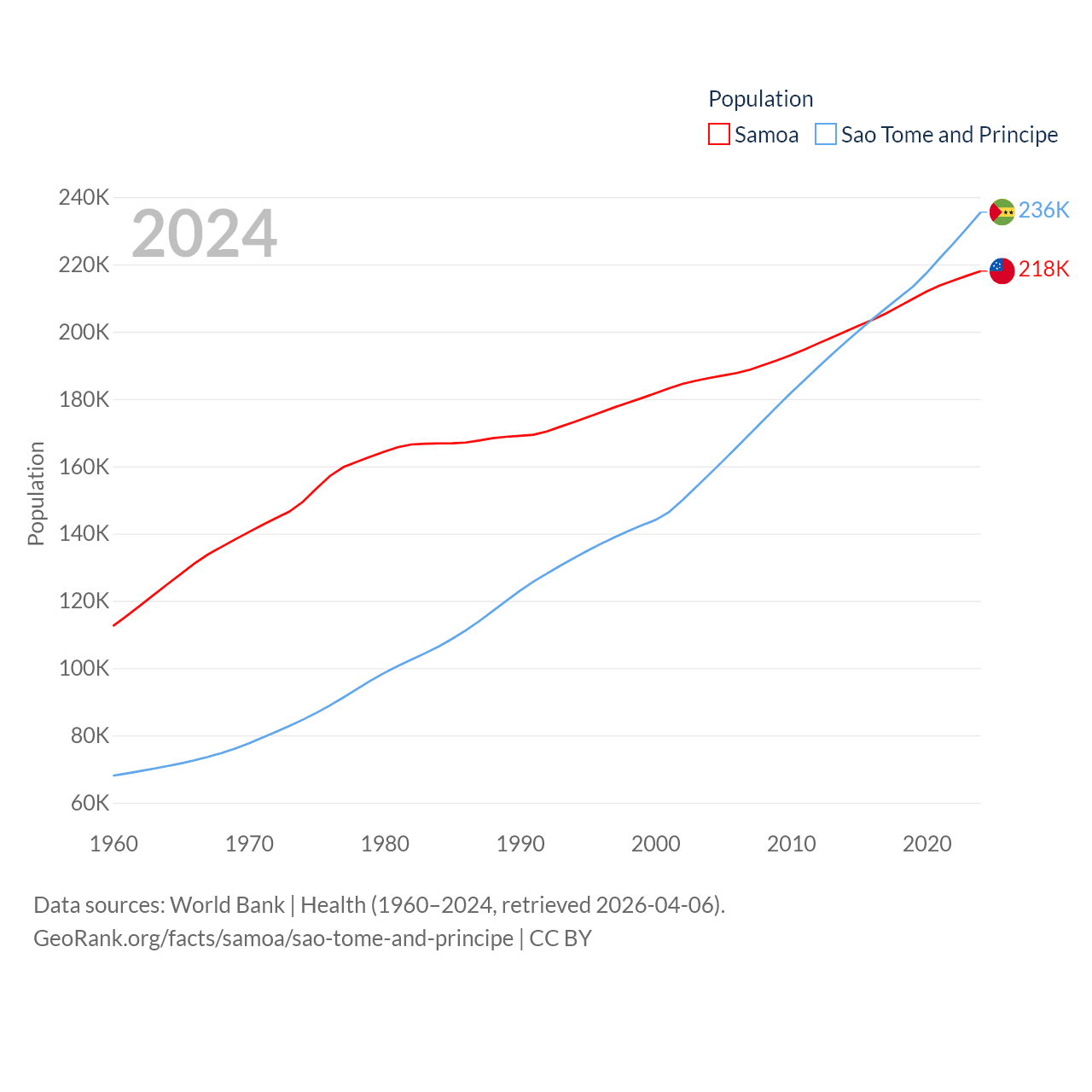 Samoa has a population of 218K (ranked 177/197), compared with 236K in Sao Tome and Principe (ranked 176/197). Samoa's land area is 1,073 sq mi versus 371 sq mi for Sao Tome and Principe (ranked 168th vs. 172nd).