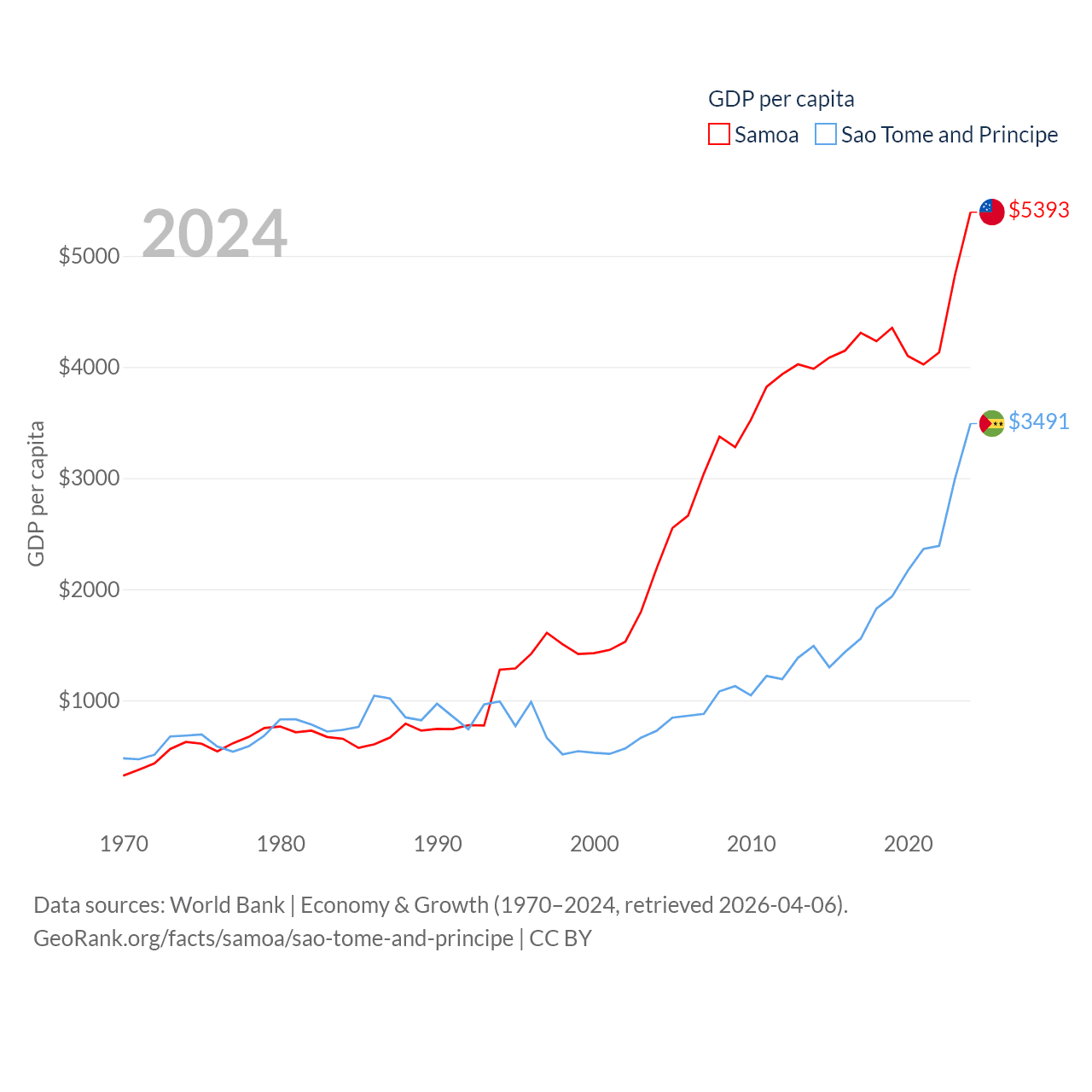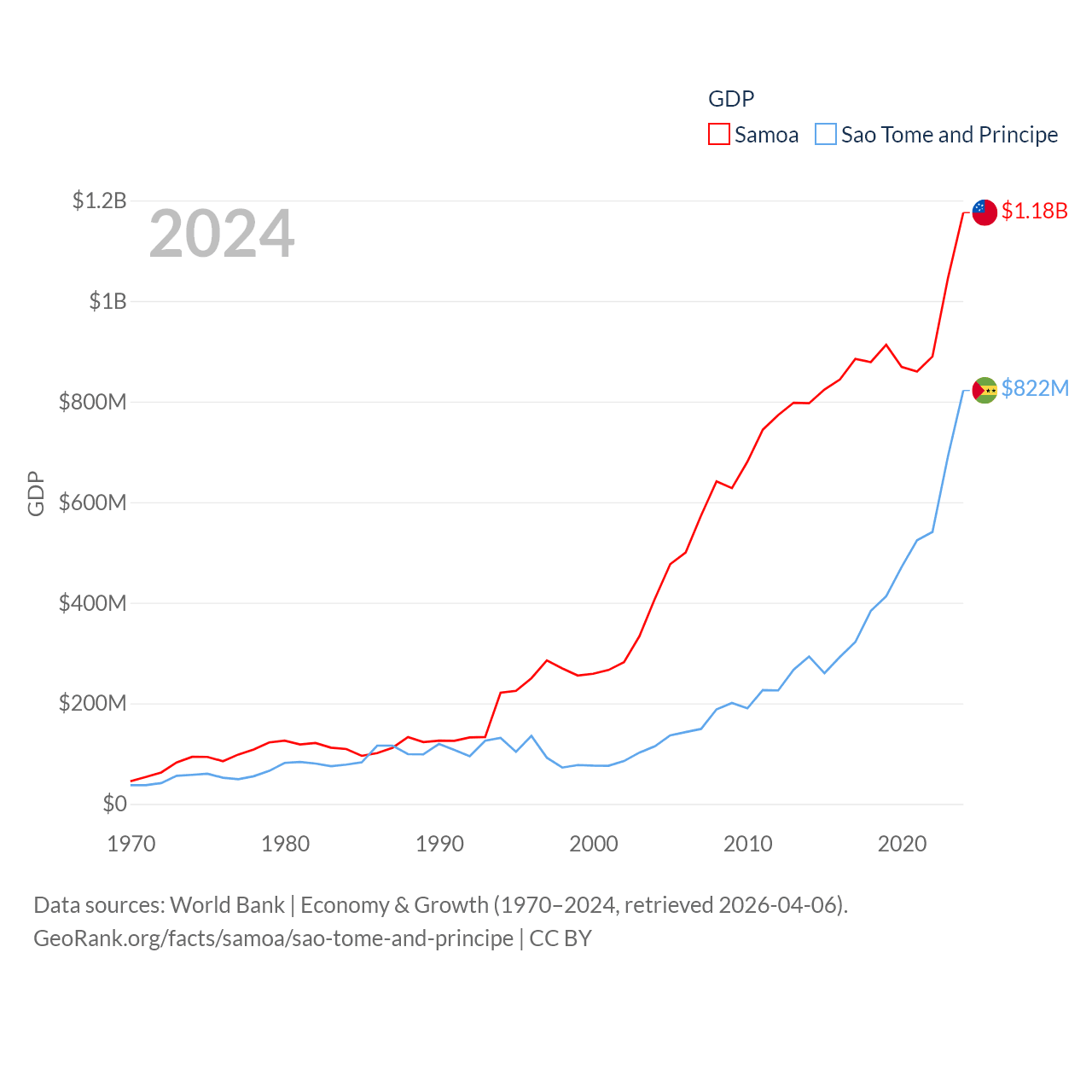 By GDP, Samoa ranks 185/197 ($1.18B) and Sao Tome and Principe ranks 189/197 ($822M). By GDP per capita, Samoa ranks 117/197 ($5,393), while Sao Tome and Principe ranks 134/197 ($3,491).