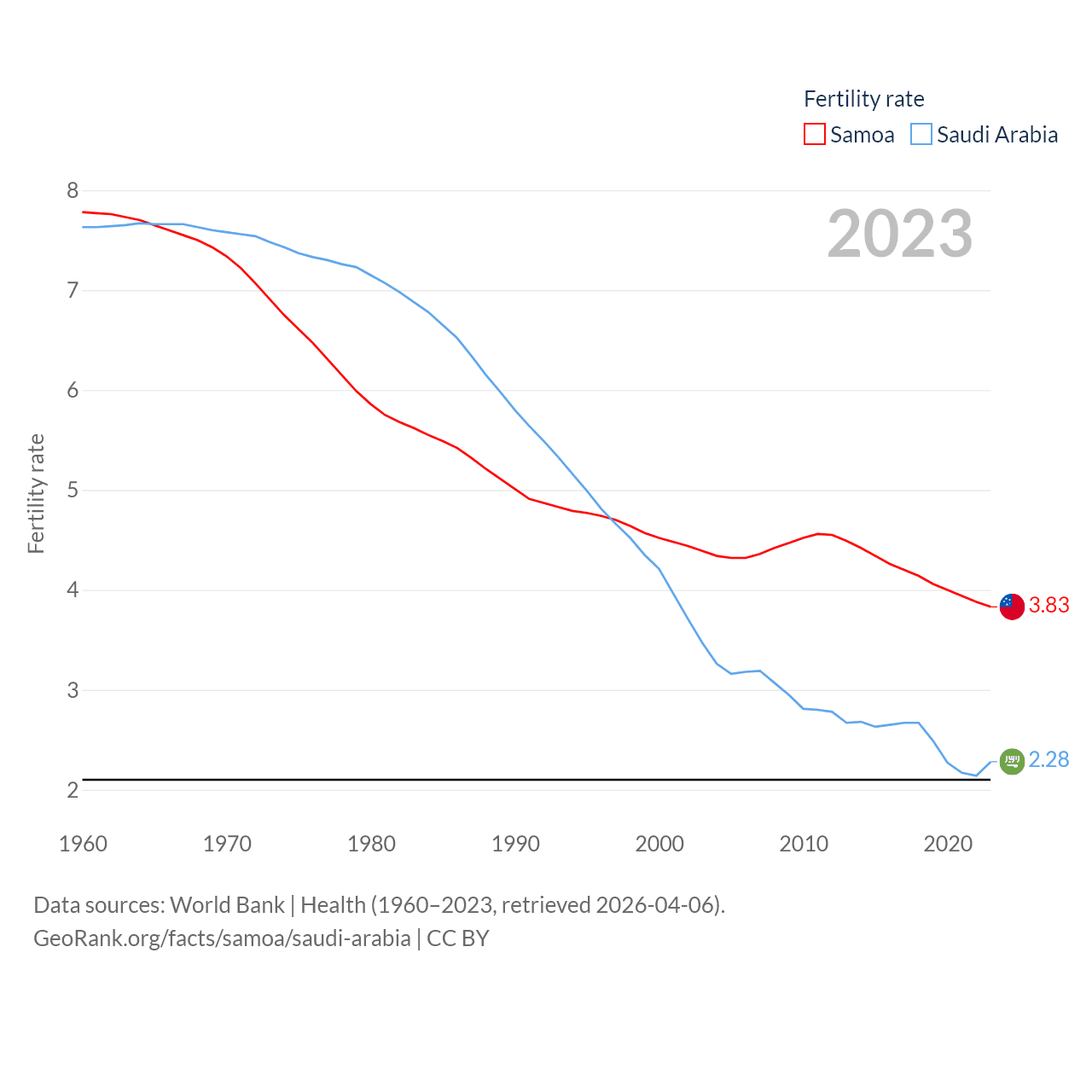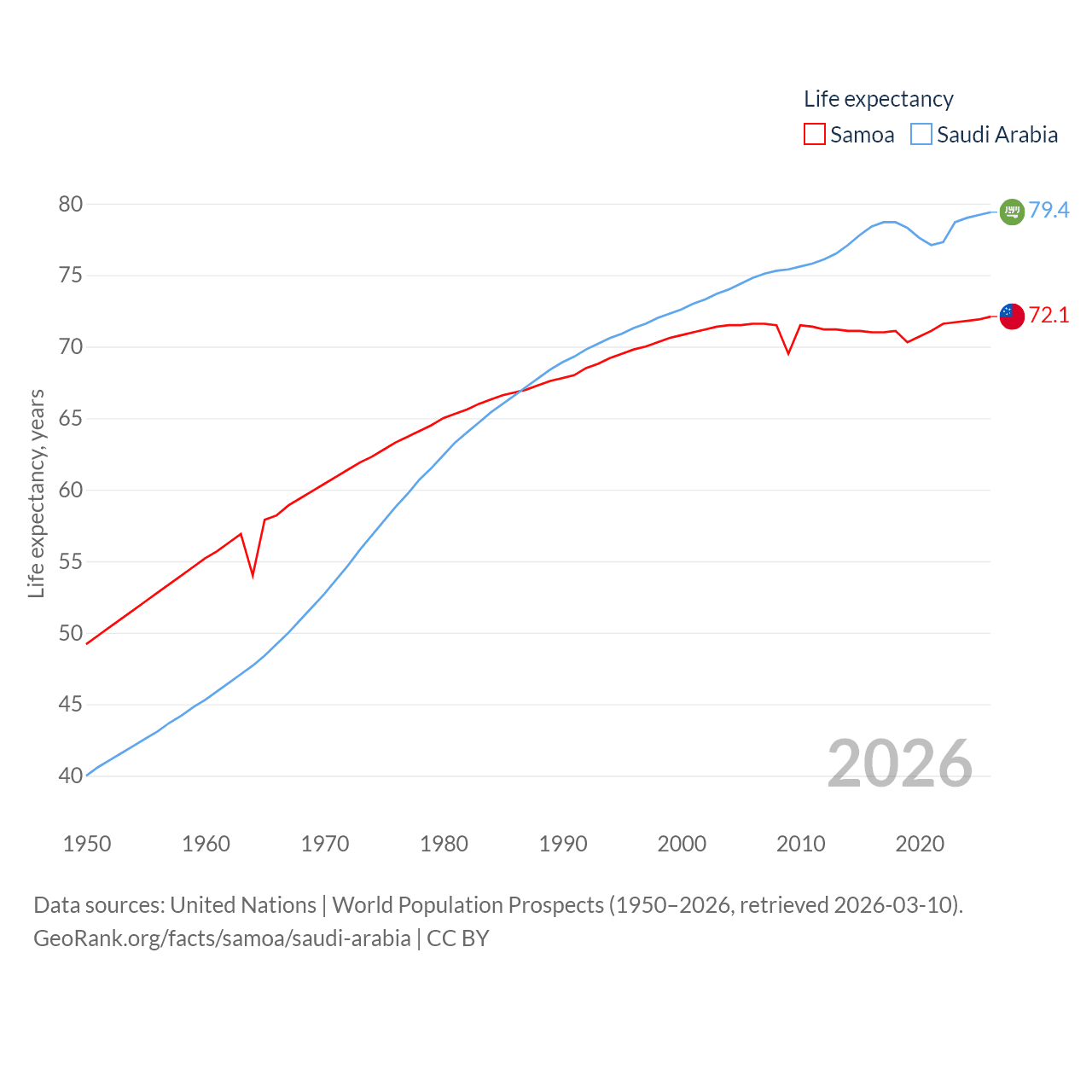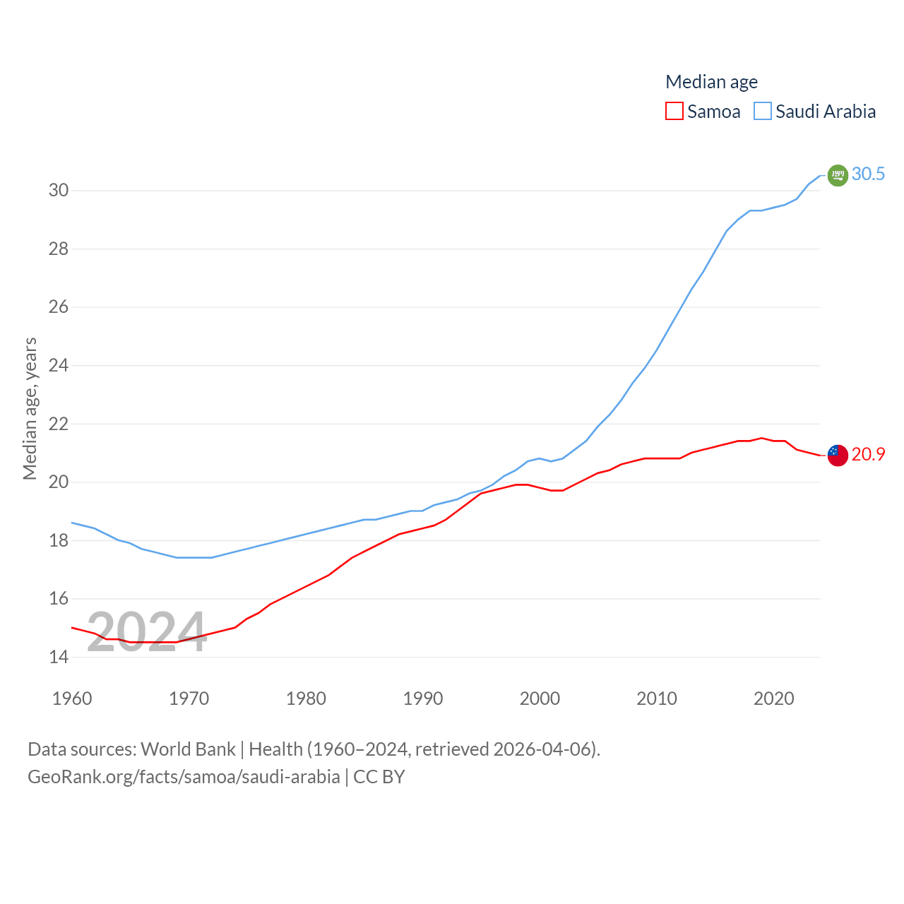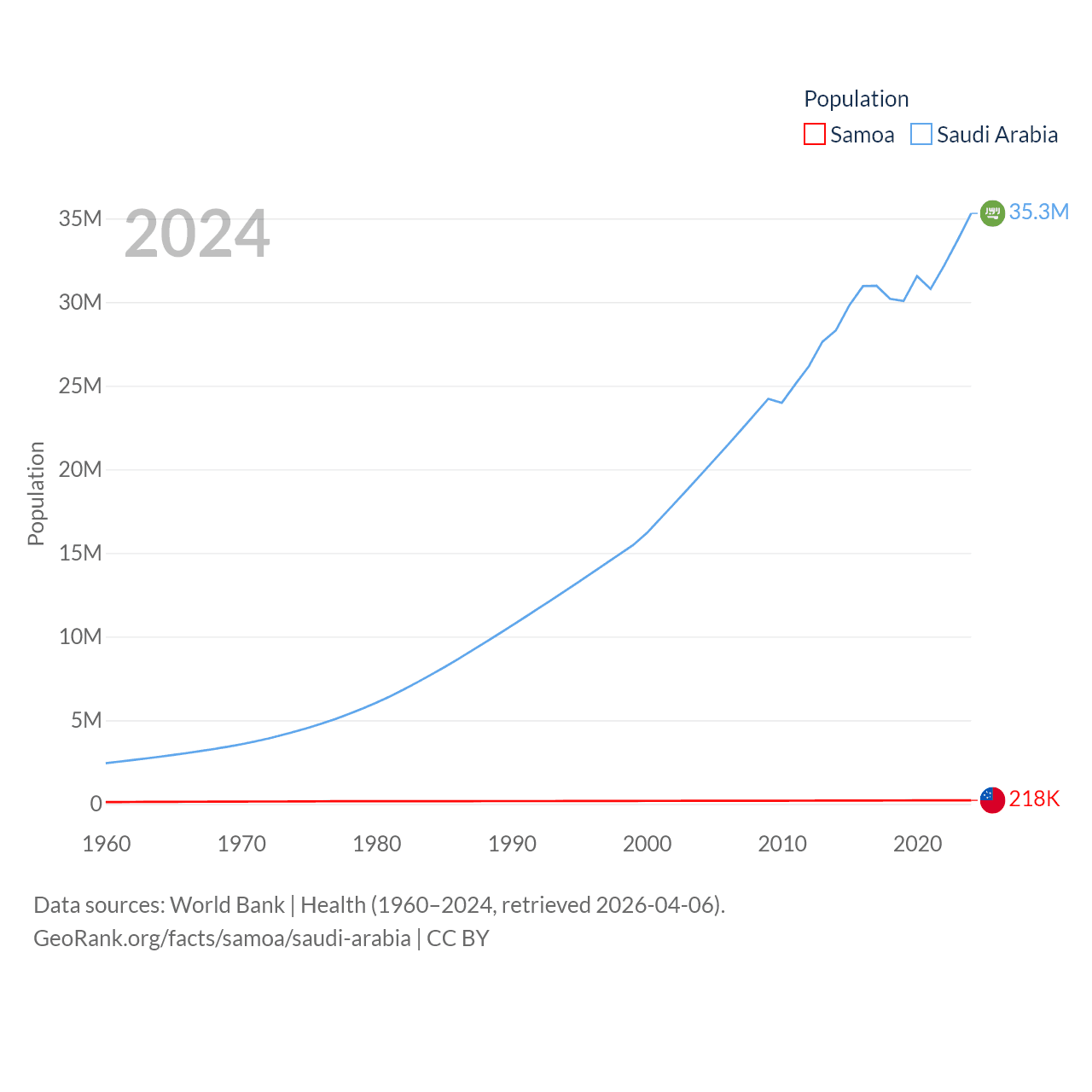 Samoa has a population of 218K (ranked 177/197), compared with 35.3M in Saudi Arabia (ranked 45/197). Samoa's land area is 1,073 sq mi versus 830,000 sq mi for Saudi Arabia (ranked 168th vs. 12th).