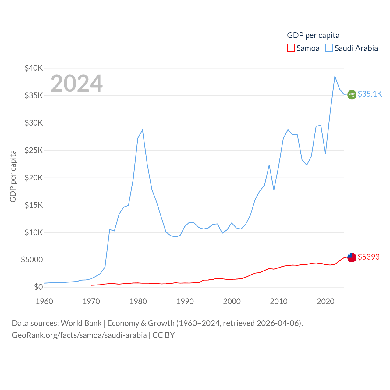 By GDP, Samoa ranks 185/197 ($1.18B) and Saudi Arabia ranks 18/197 ($1.24T). By GDP per capita, Samoa ranks 117/197 ($5,393), while Saudi Arabia ranks 33/197 ($35,122).