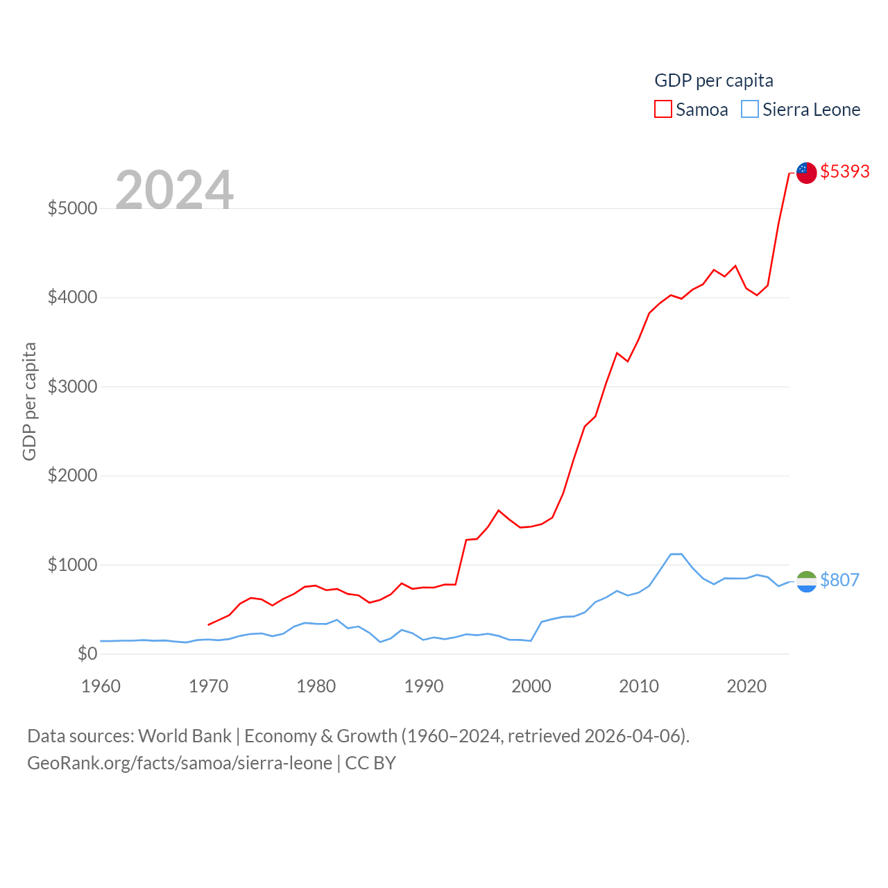 By GDP, Samoa ranks 185/197 ($1.18B) and Sierra Leone ranks 160/197 ($6.97B). By GDP per capita, Samoa ranks 117/197 ($5,393), while Sierra Leone ranks 186/197 ($807).