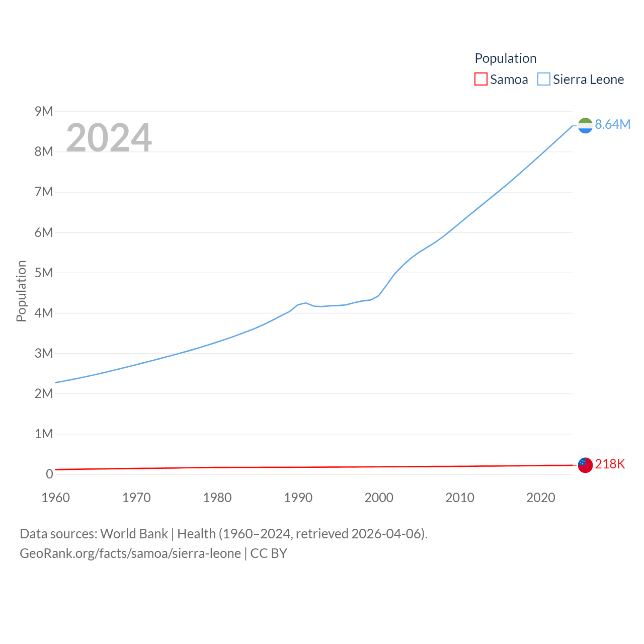 Samoa has a population of 218K (ranked 177/197), compared with 8.64M in Sierra Leone (ranked 102/197). Samoa's land area is 1,073 sq mi versus 27,869 sq mi for Sierra Leone (ranked 168th vs. 116th).