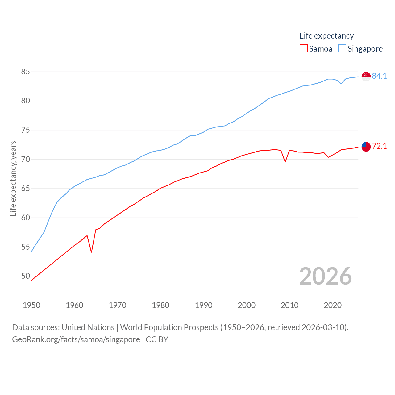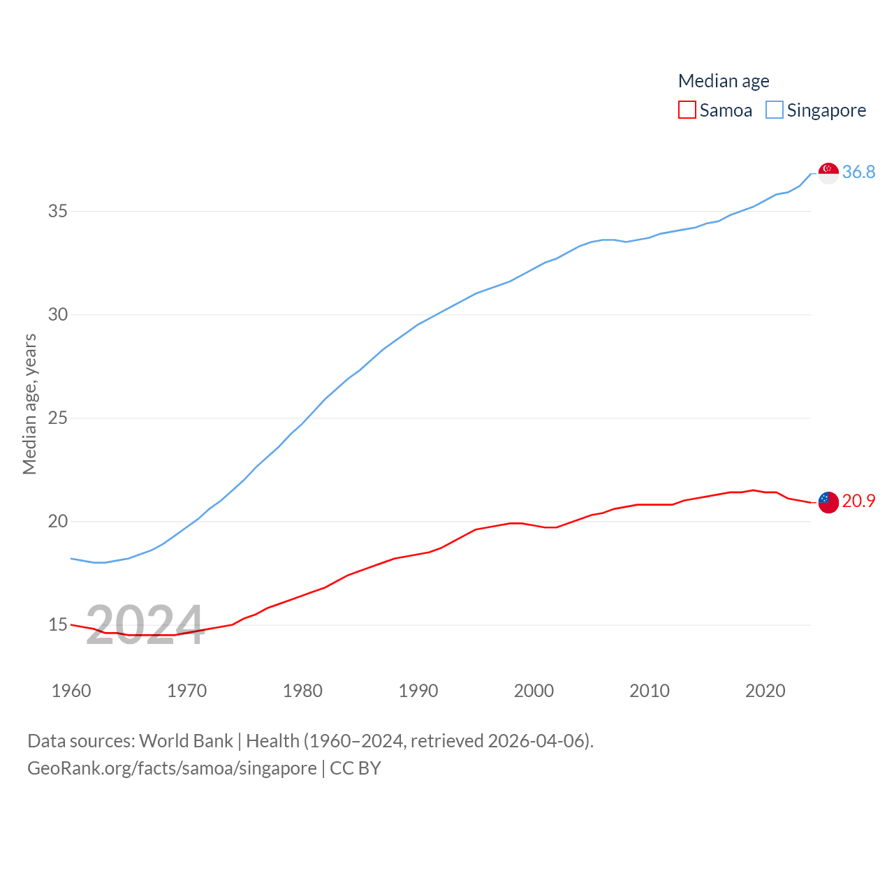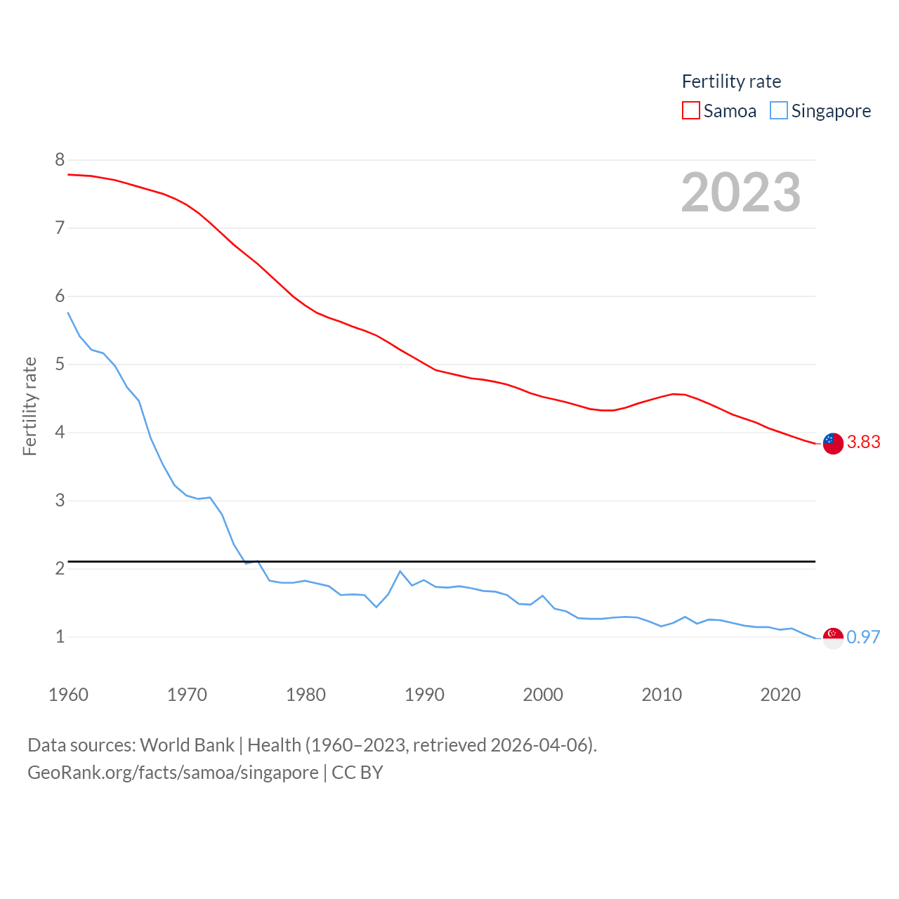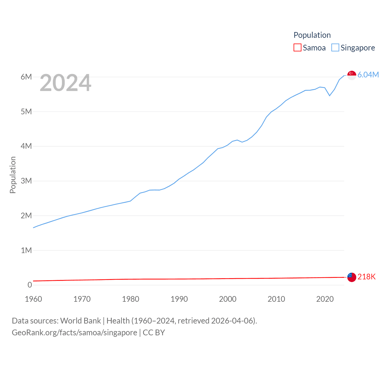 Samoa has a population of 218K (ranked 177/197), compared with 6.04M in Singapore (ranked 113/197). Samoa's land area is 1,073 sq mi versus 277.2 sq mi for Singapore (ranked 168th vs. 177th).