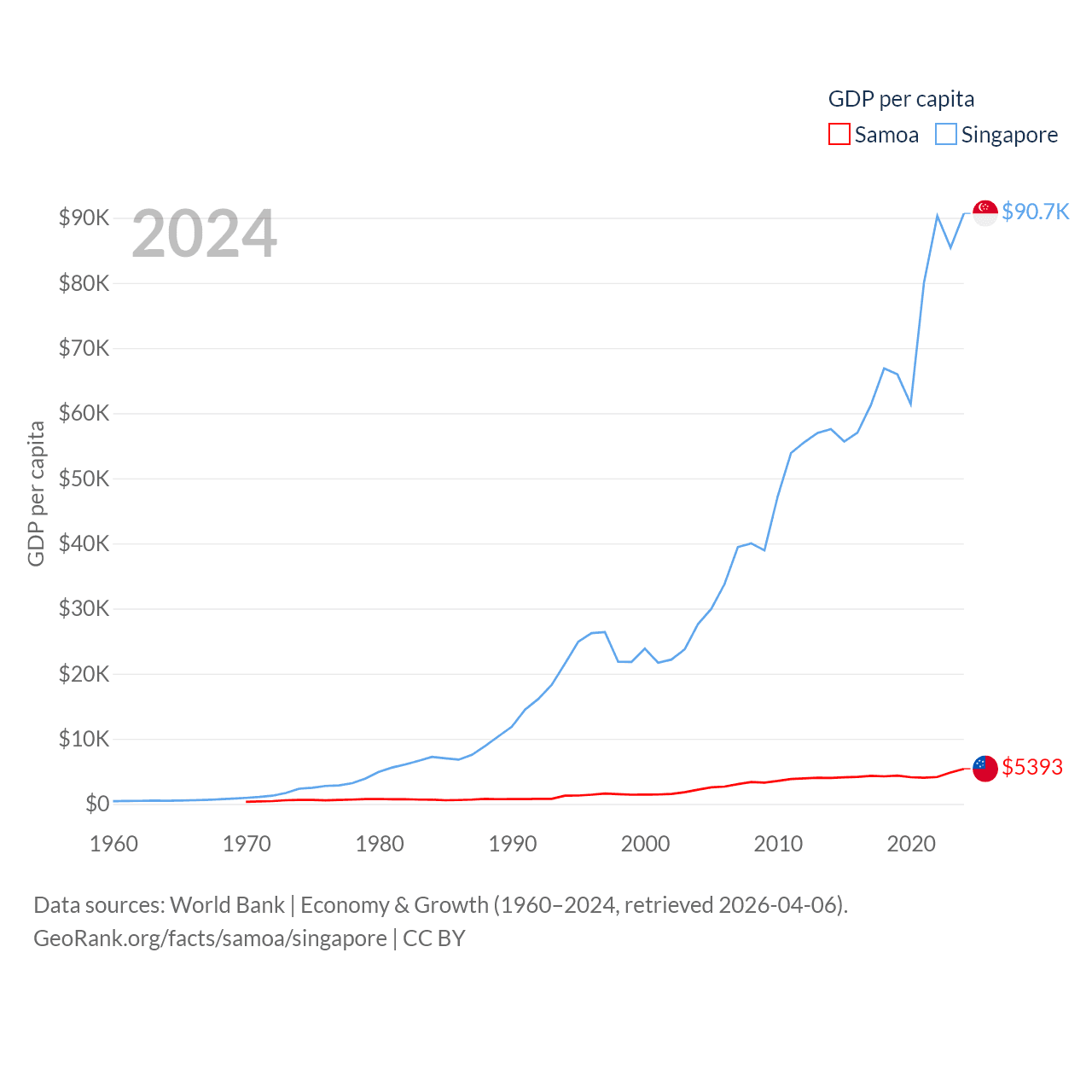 By GDP, Samoa ranks 185/197 ($1.18B) and Singapore ranks 28/197 ($547B). By GDP per capita, Samoa ranks 117/197 ($5,393), while Singapore ranks 7/197 ($90,674).