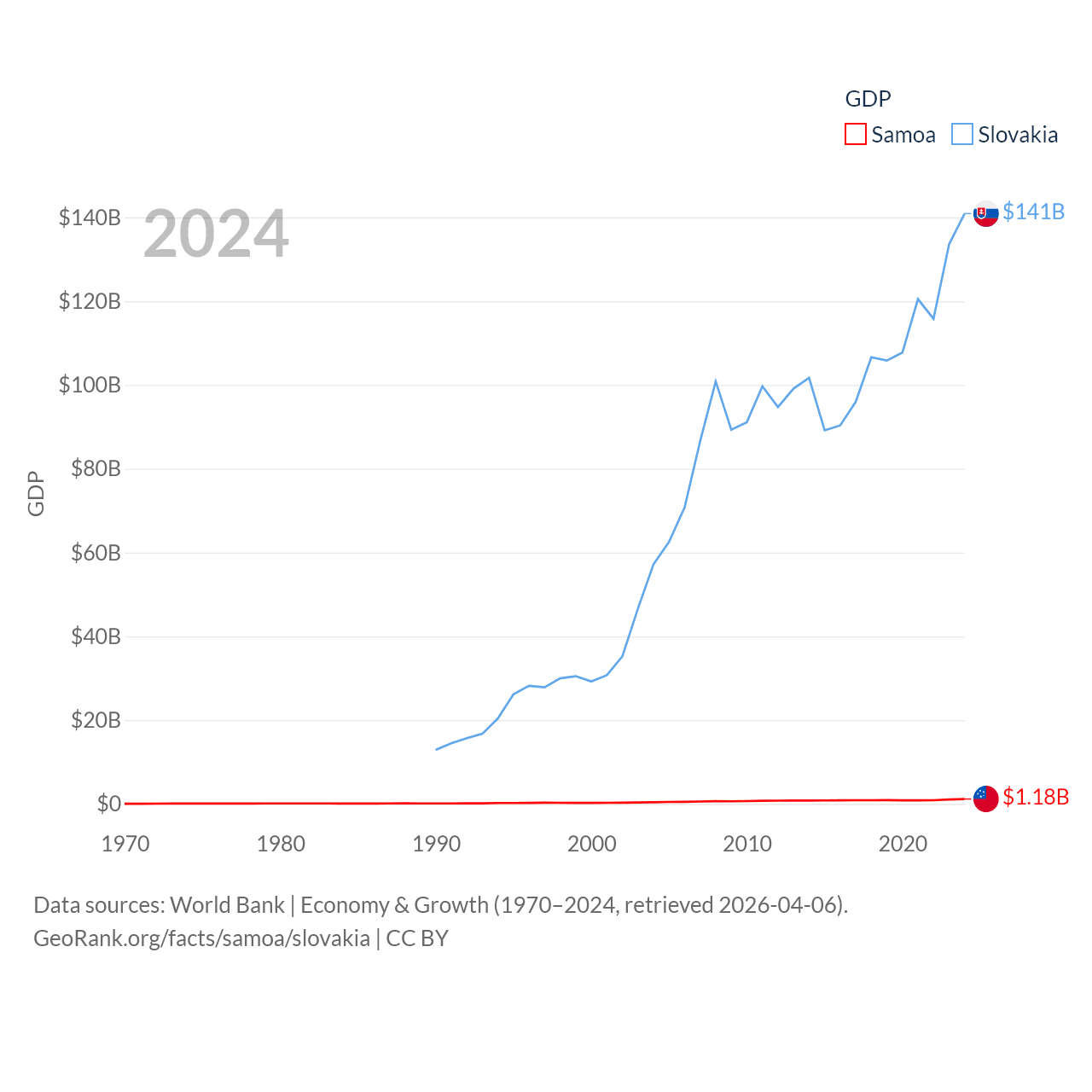 By GDP, Samoa ranks 185/197 ($1.18B) and Slovakia ranks 61/197 ($141B). By GDP per capita, Samoa ranks 117/197 ($5,393), while Slovakia ranks 47/197 ($25,993).