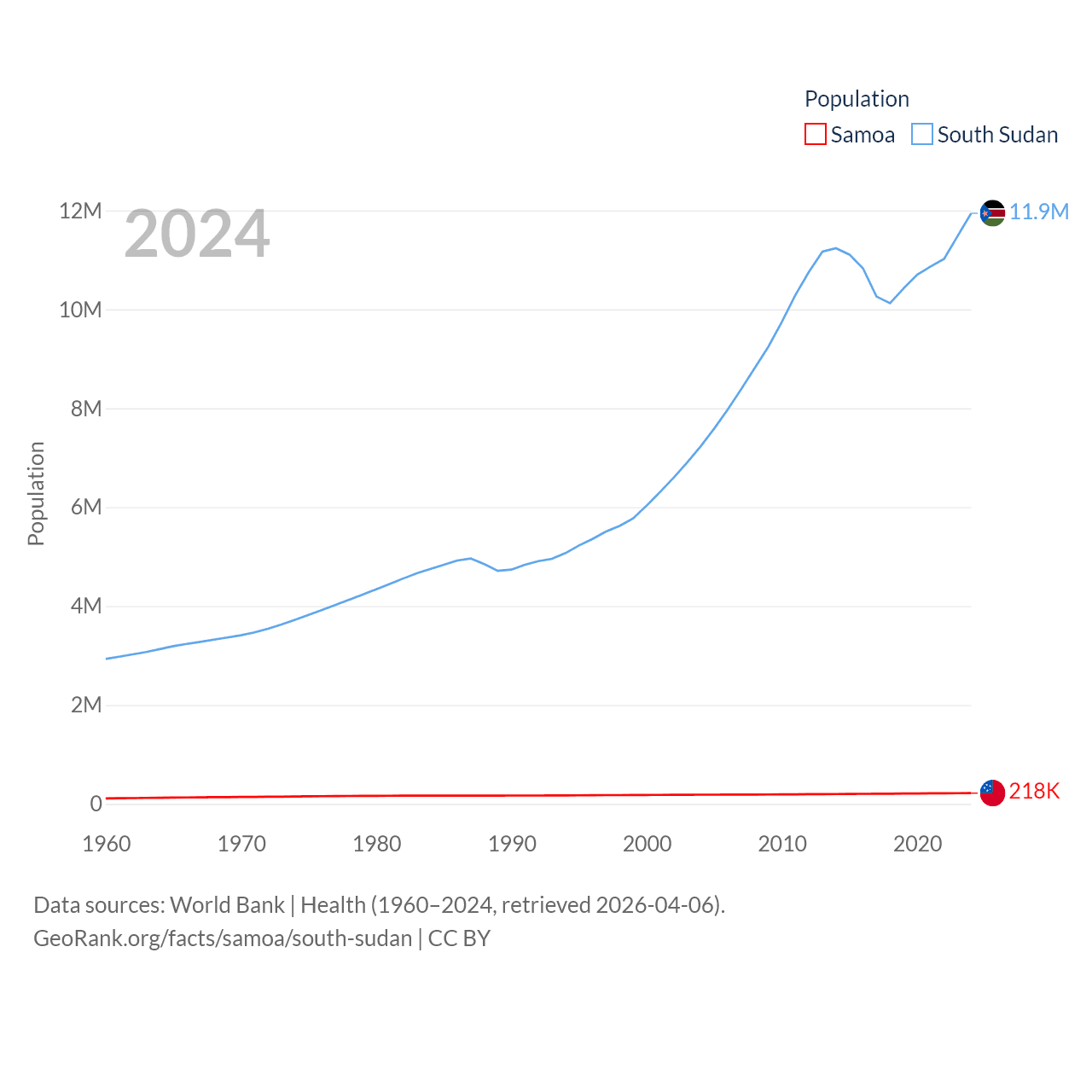 Samoa has a population of 218K (ranked 177/197), compared with 11.9M in South Sudan (ranked 81/197). Samoa's land area is 1,073 sq mi versus 243,990 sq mi for South Sudan (ranked 168th vs. 41st).