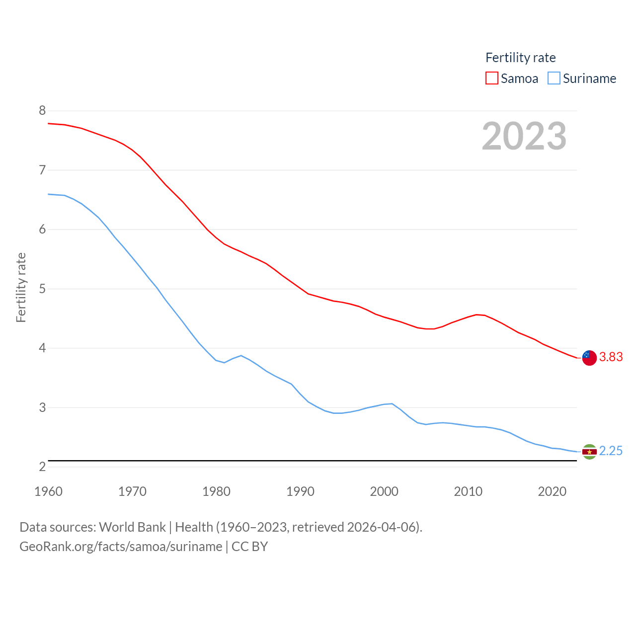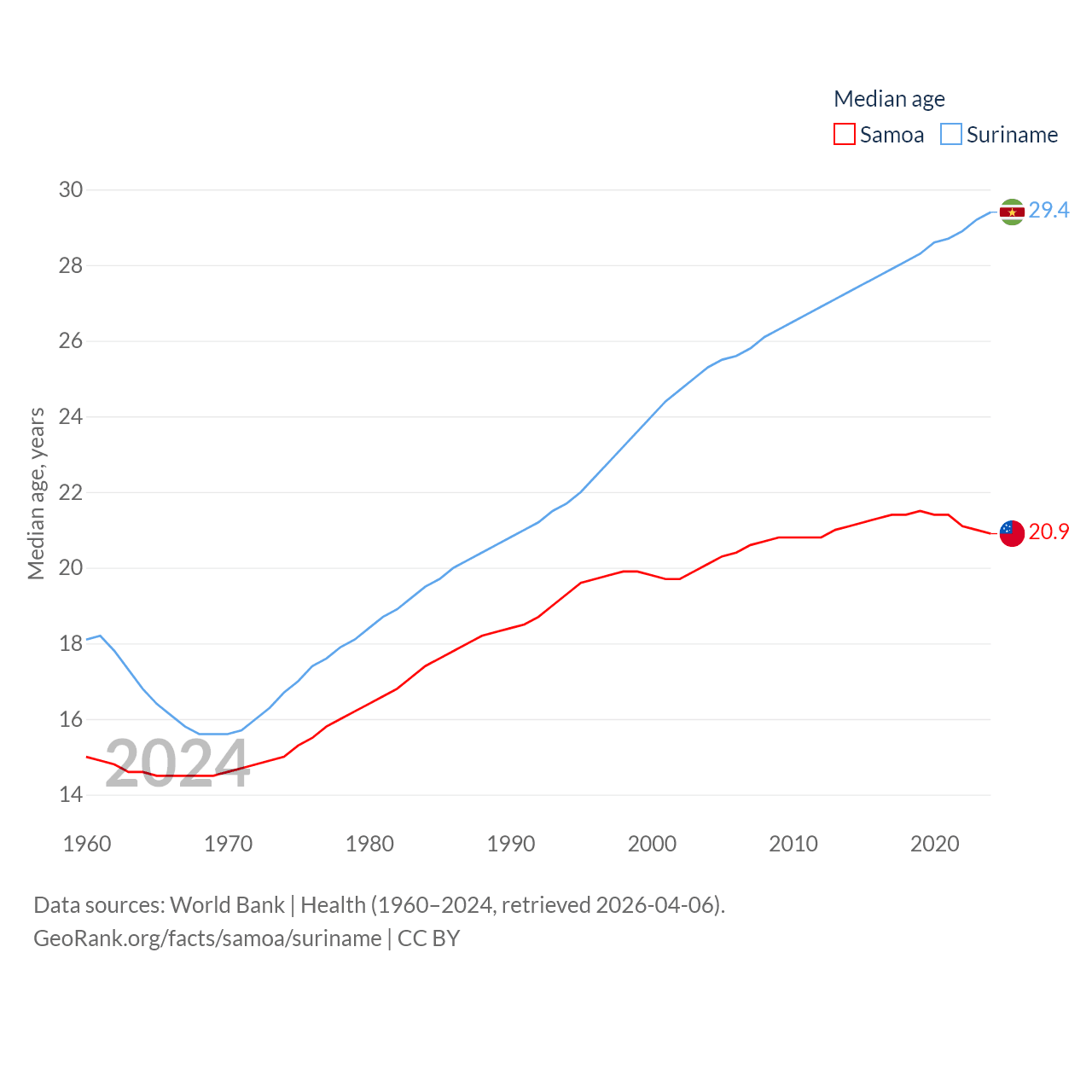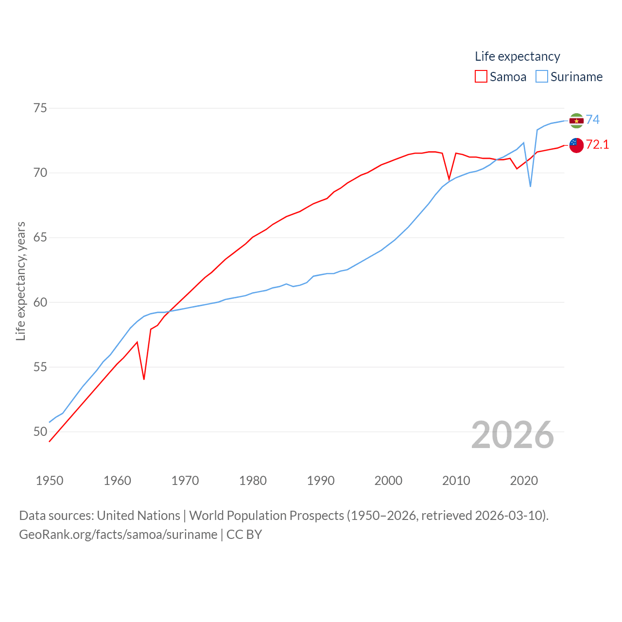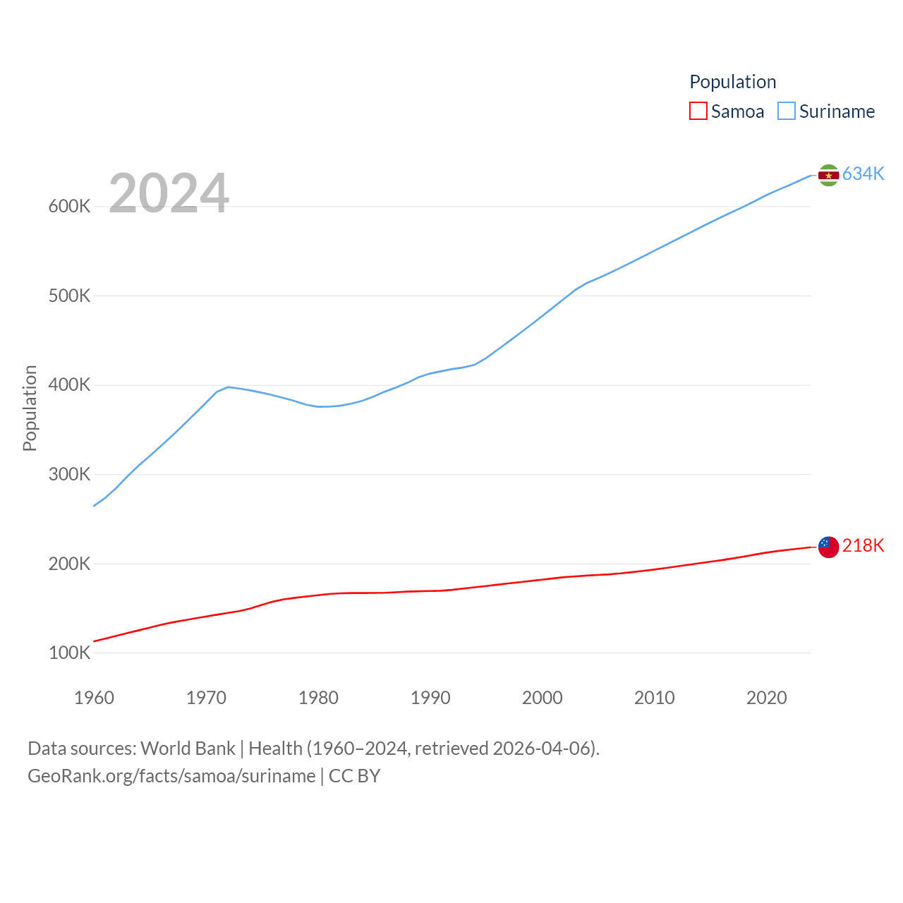 Samoa has a population of 218K (ranked 177/197), compared with 634K in Suriname (ranked 165/197). Samoa's land area is 1,073 sq mi versus 61,972 sq mi for Suriname (ranked 168th vs. 90th).