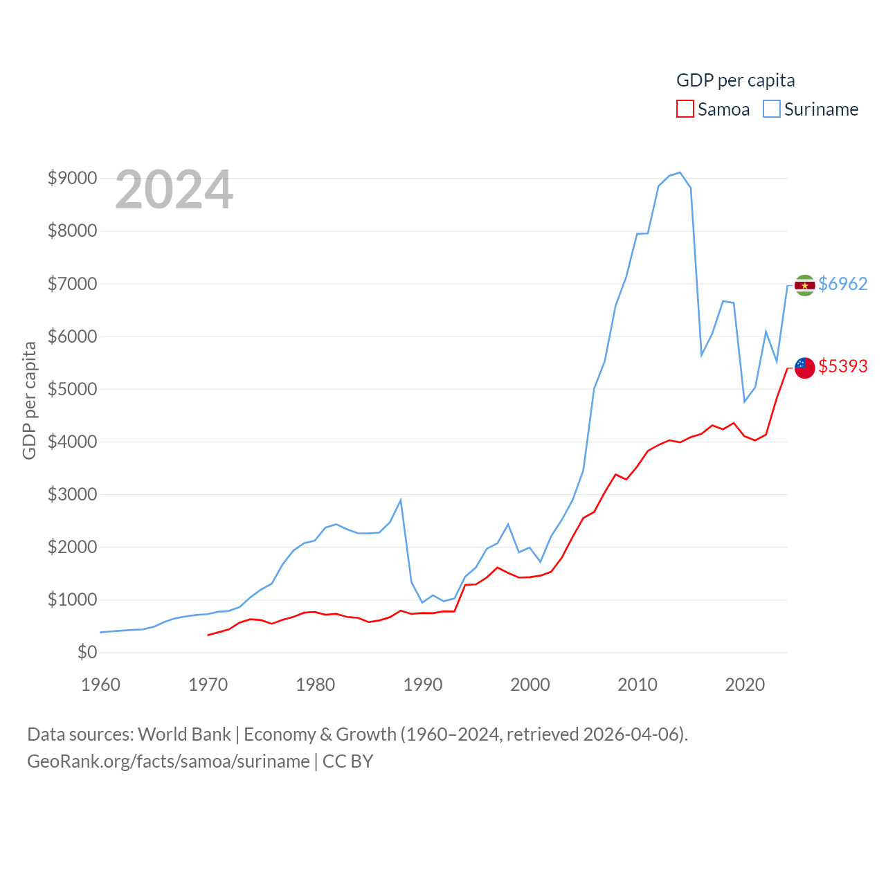 By GDP, Samoa ranks 185/197 ($1.18B) and Suriname ranks 164/197 ($4.42B). By GDP per capita, Samoa ranks 117/197 ($5,393), while Suriname ranks 102/197 ($6,962).