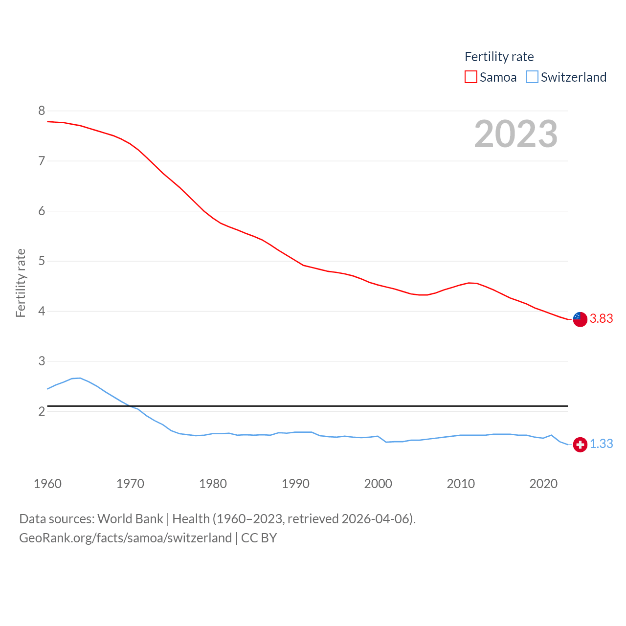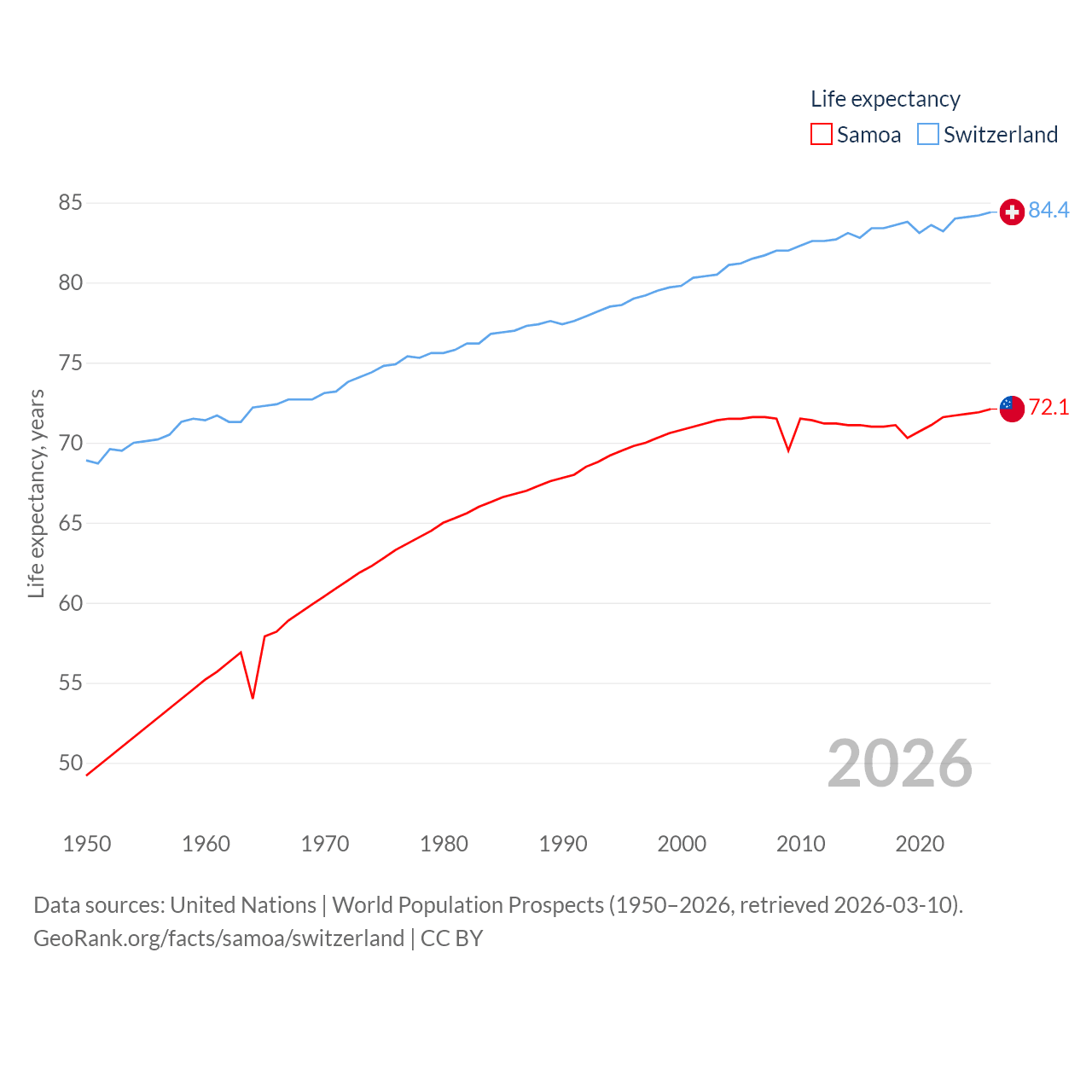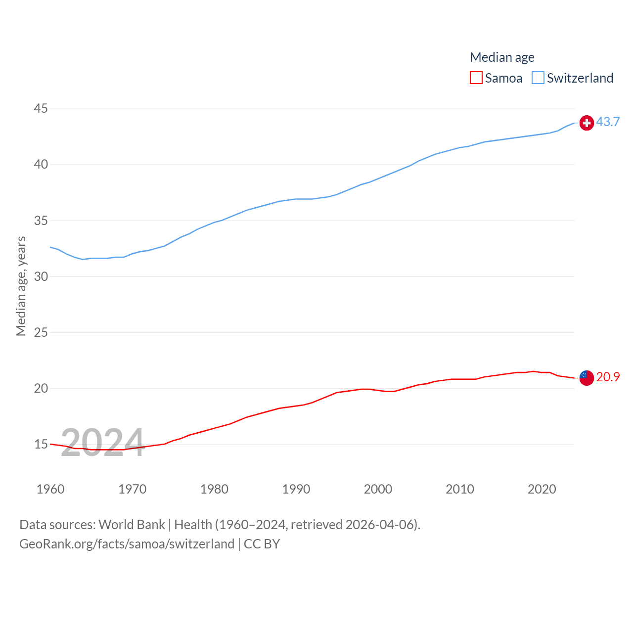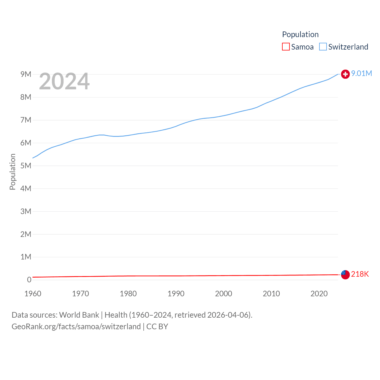 Samoa has a population of 218K (ranked 177/197), compared with 9.01M in Switzerland (ranked 101/197). Samoa's land area is 1,073 sq mi versus 15,255 sq mi for Switzerland (ranked 168th vs. 131st).