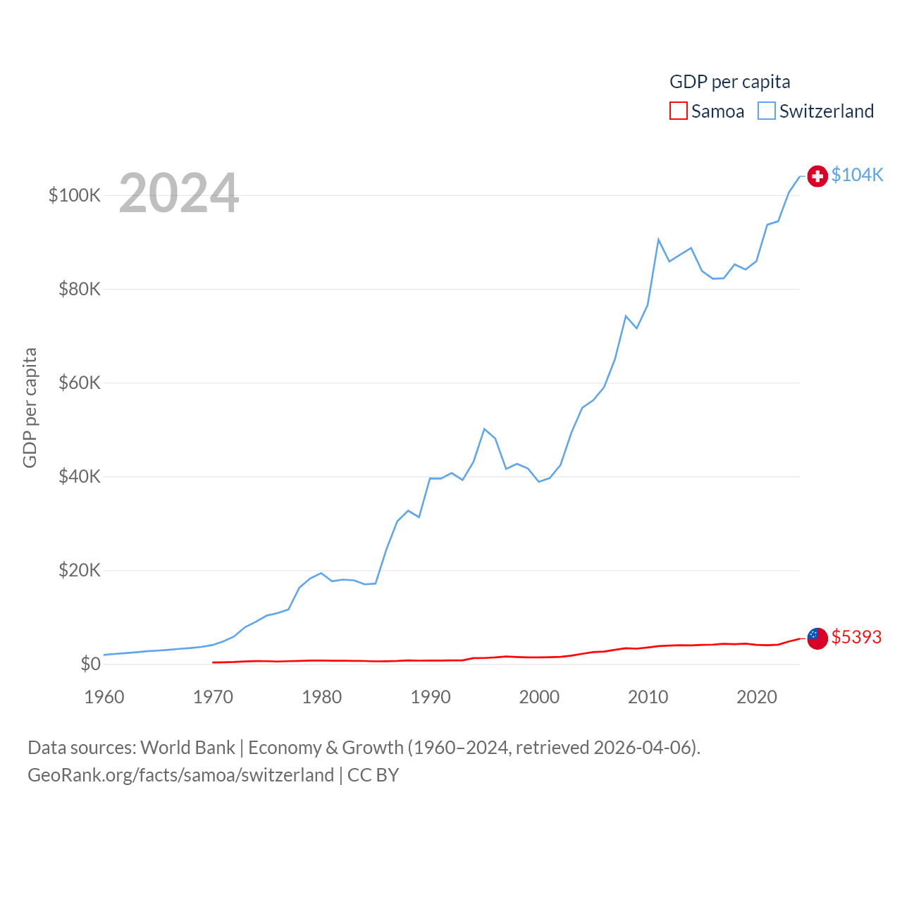 By GDP, Samoa ranks 185/197 ($1.18B) and Switzerland ranks 20/197 ($937B). By GDP per capita, Samoa ranks 117/197 ($5,393), while Switzerland ranks 5/197 ($103,998).