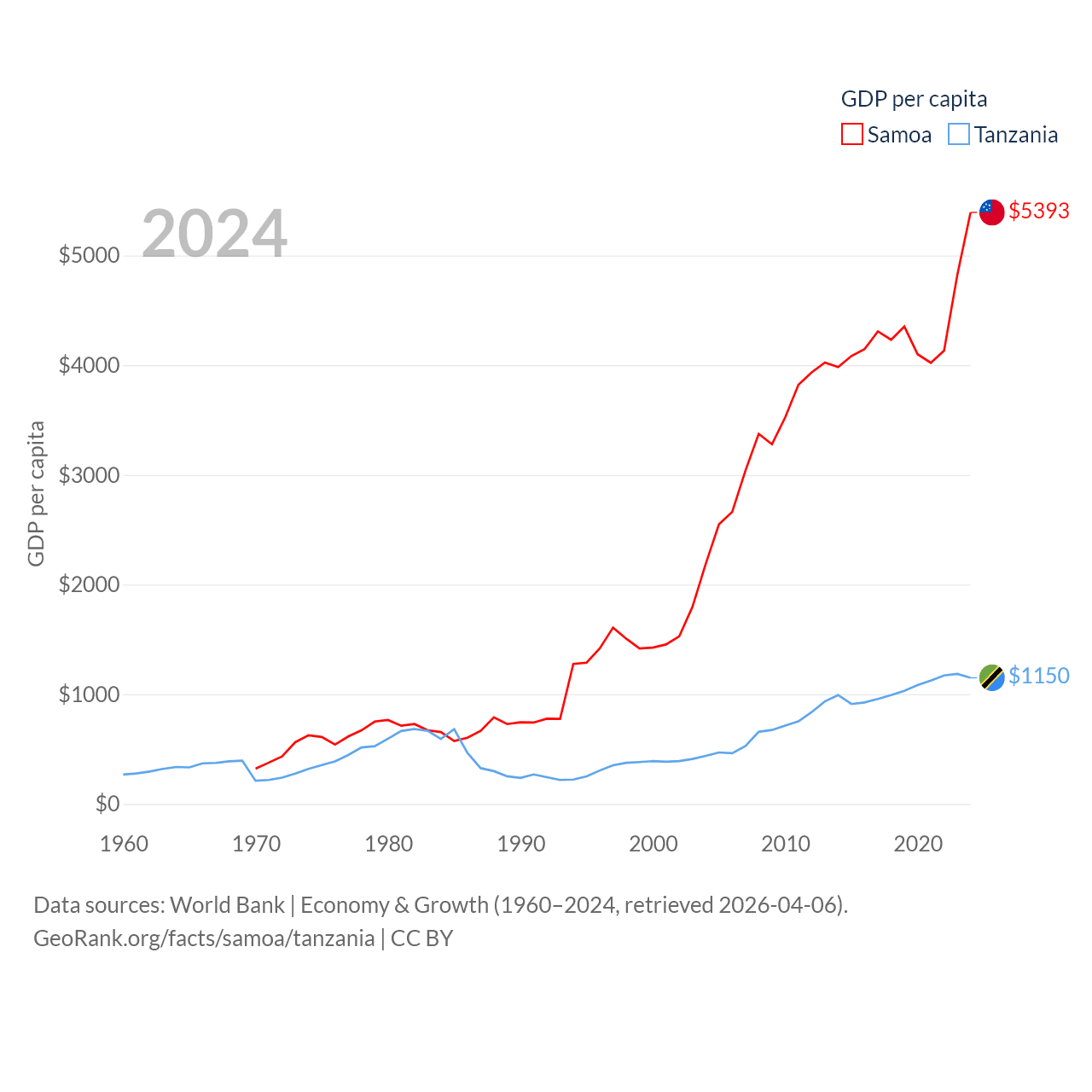By GDP, Samoa ranks 185/197 ($1.18B) and Tanzania ranks 82/197 ($78.8B). By GDP per capita, Samoa ranks 117/197 ($5,393), while Tanzania ranks 170/197 ($1,150).