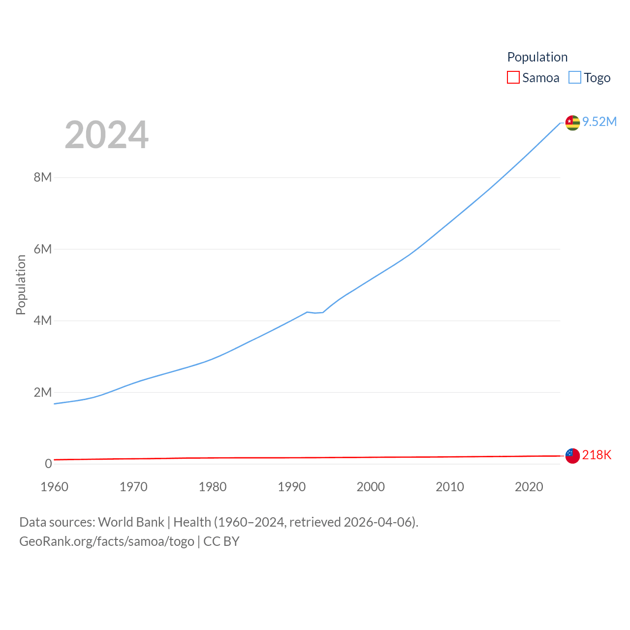 Samoa has a population of 218K (ranked 177/197), compared with 9.52M in Togo (ranked 98/197). Samoa's land area is 1,073 sq mi versus 21,000 sq mi for Togo (ranked 168th vs. 124th).