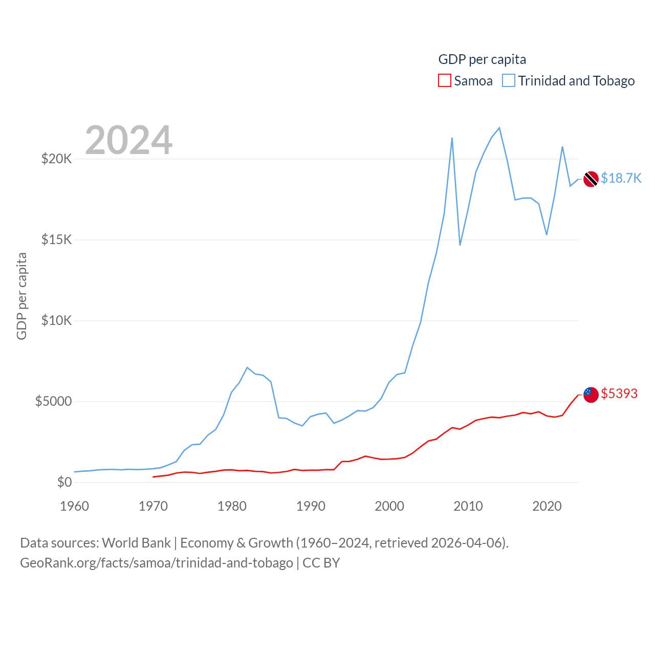 By GDP, Samoa ranks 185/197 ($1.18B) and Trinidad and Tobago ranks 115/197 ($25.6B). By GDP per capita, Samoa ranks 117/197 ($5,393), while Trinidad and Tobago ranks 61/197 ($18,733).