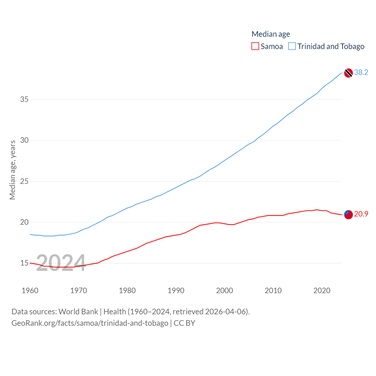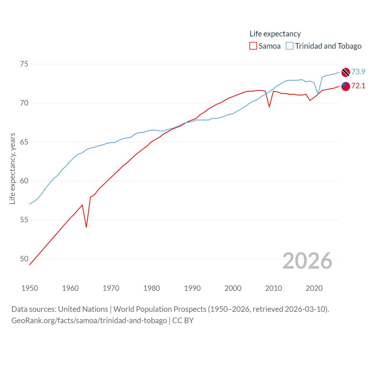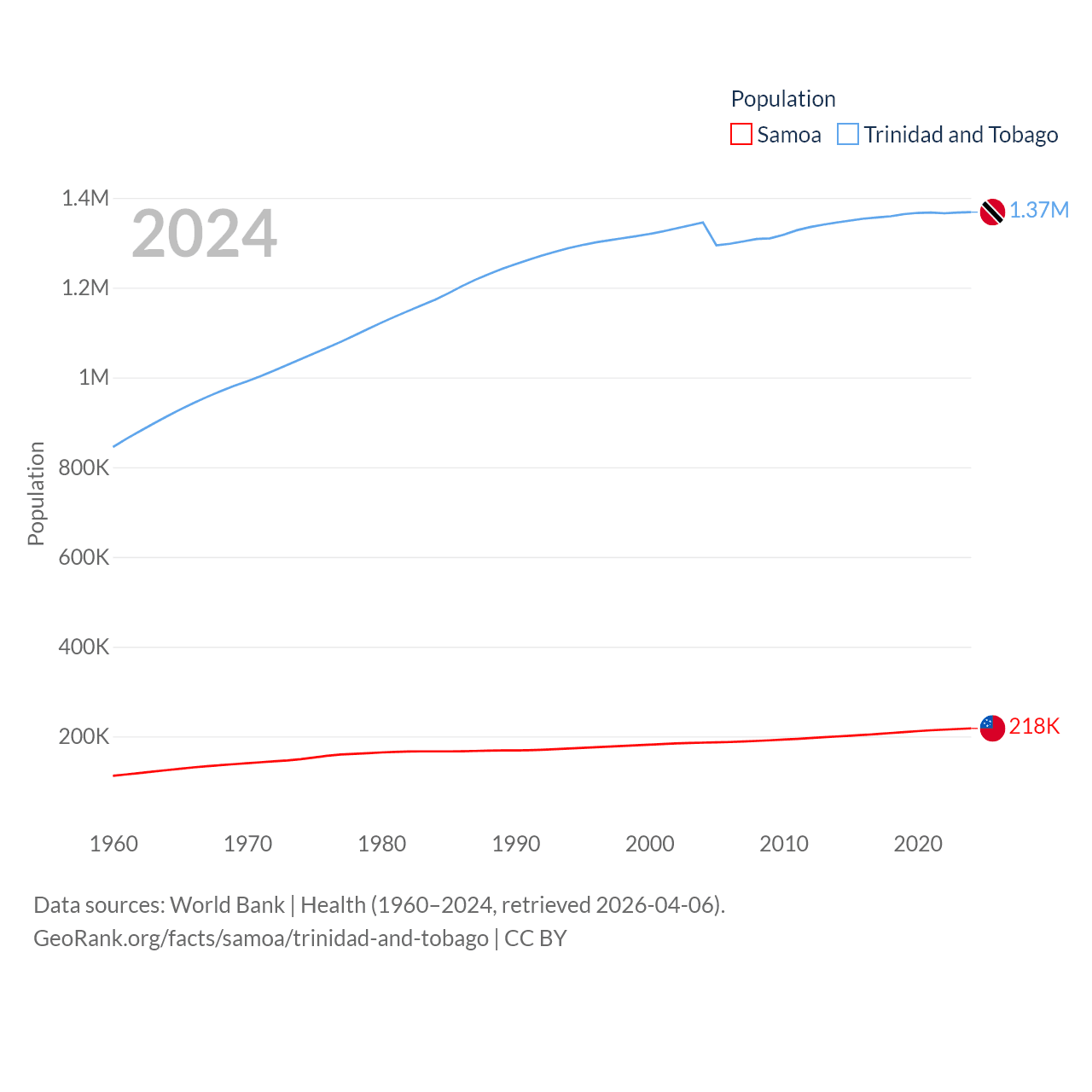Samoa has a population of 218K (ranked 177/197), compared with 1.37M in Trinidad and Tobago (ranked 154/197). Samoa's land area is 1,073 sq mi versus 1,981 sq mi for Trinidad and Tobago (ranked 168th vs. 166th).