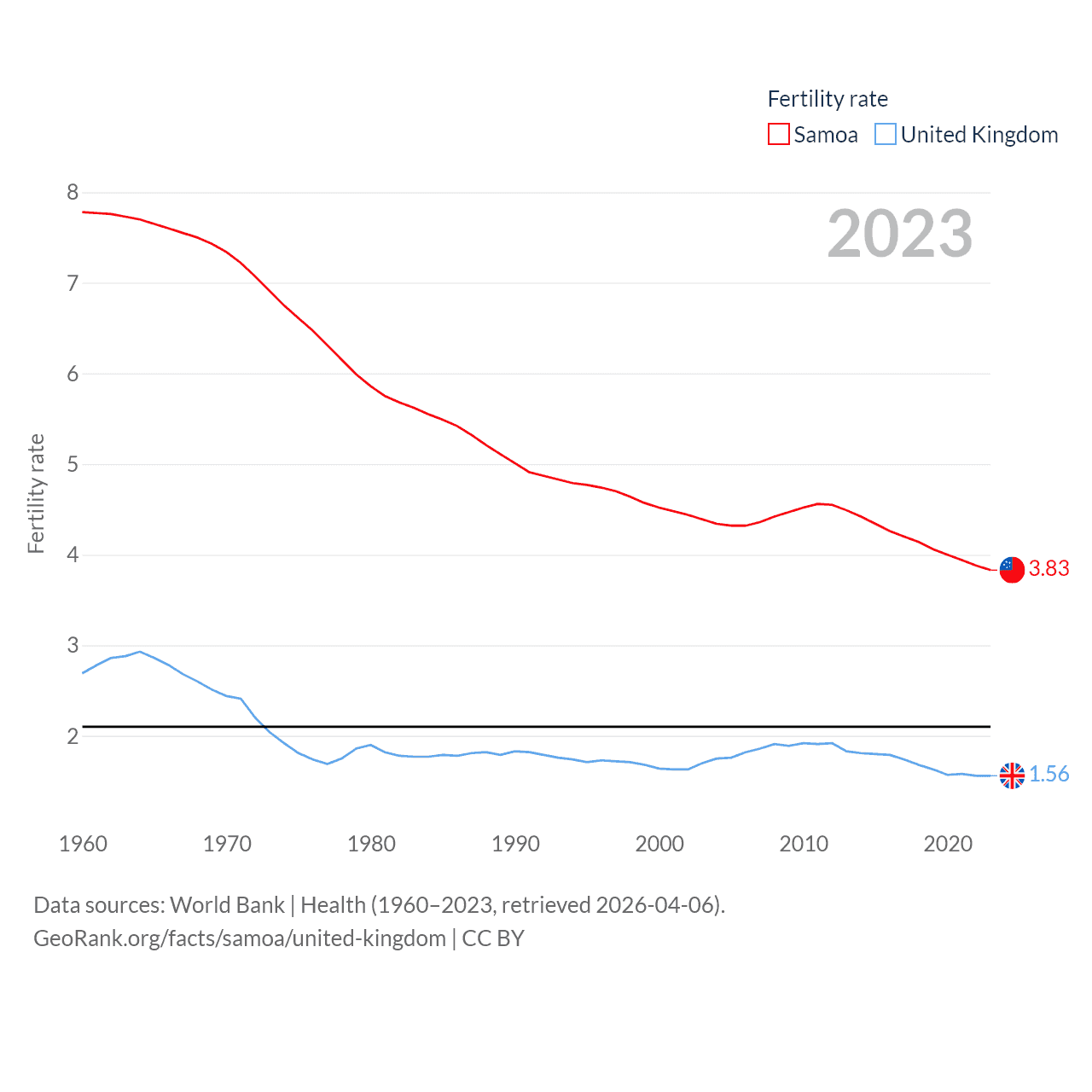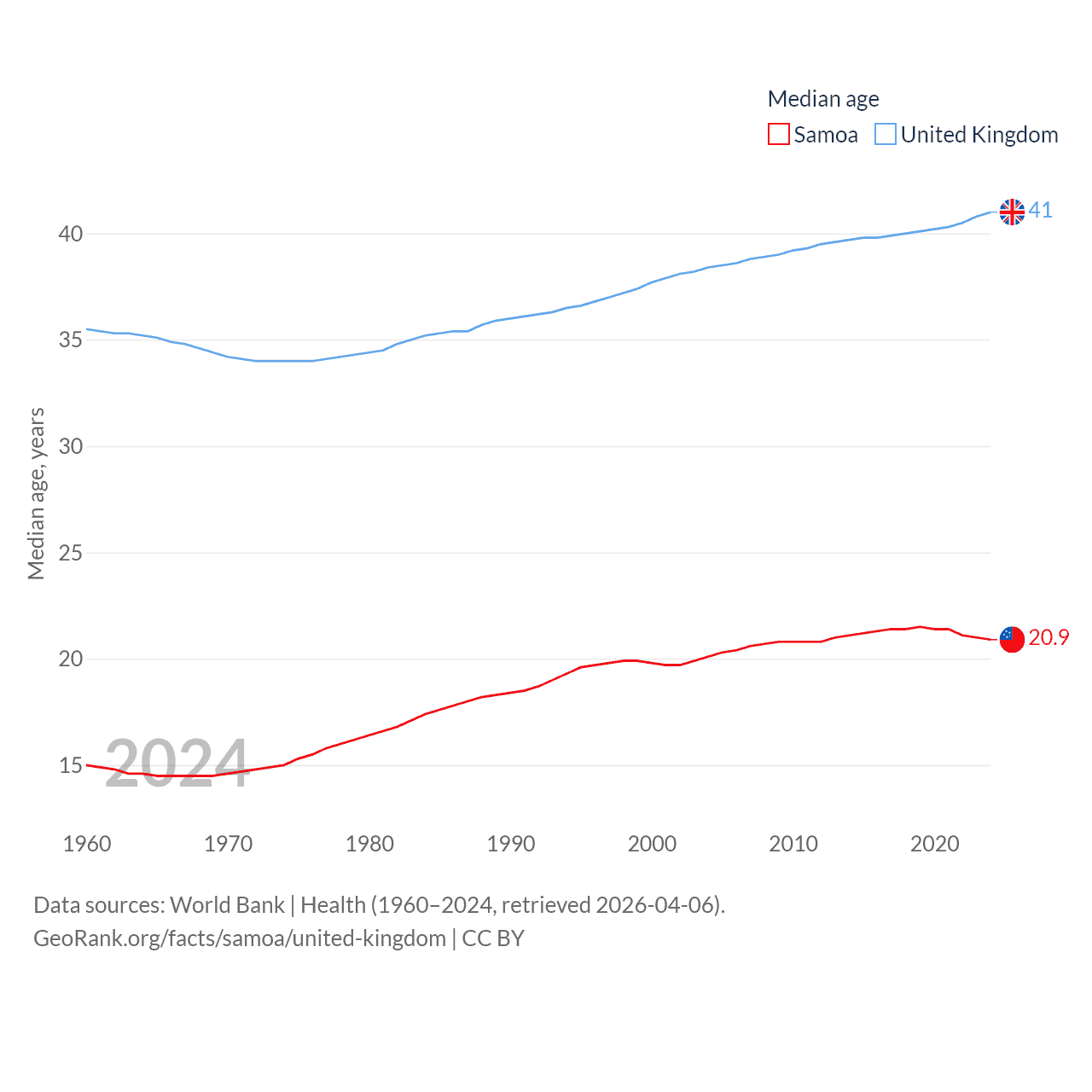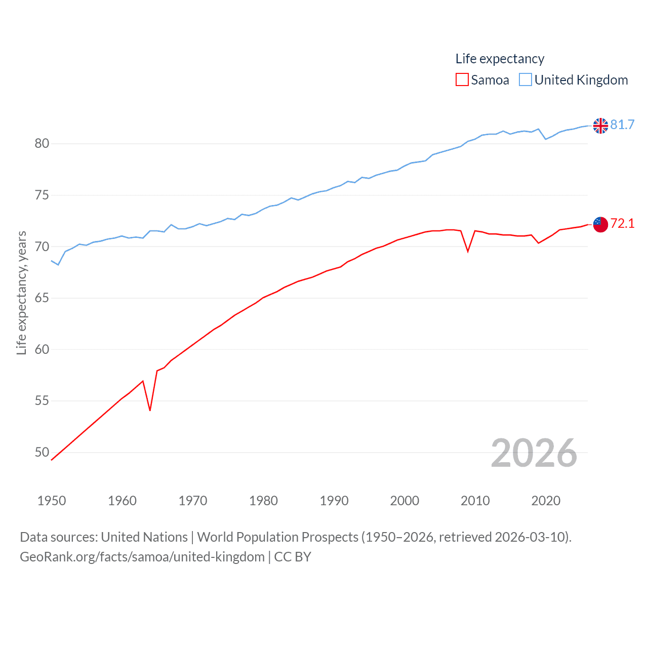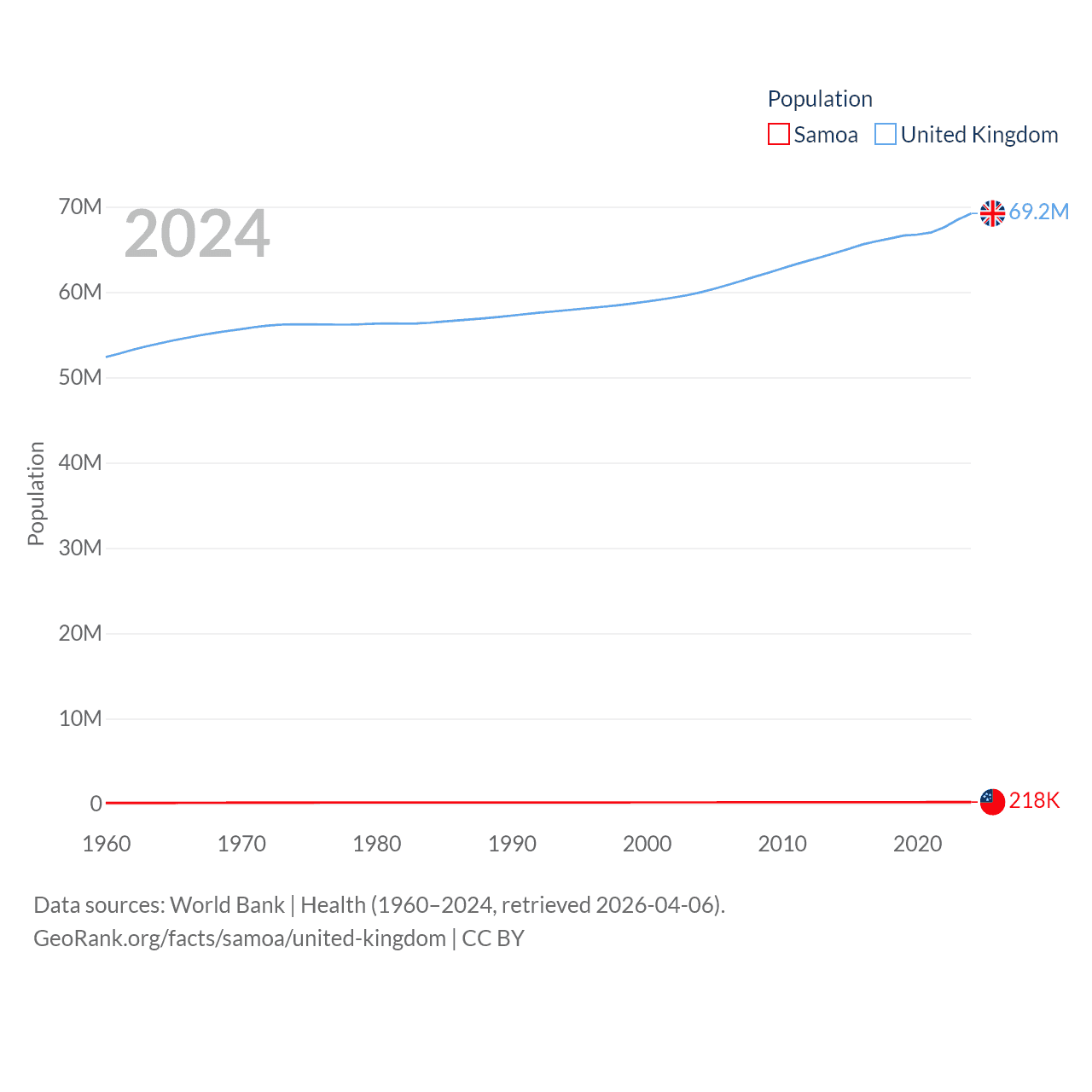 Samoa has a population of 218K (ranked 177/197), compared with 69.2M in The United Kingdom (ranked 21/197). Samoa's land area is 1,073 sq mi versus 93,410 sq mi for The United Kingdom (ranked 168th vs. 78th).