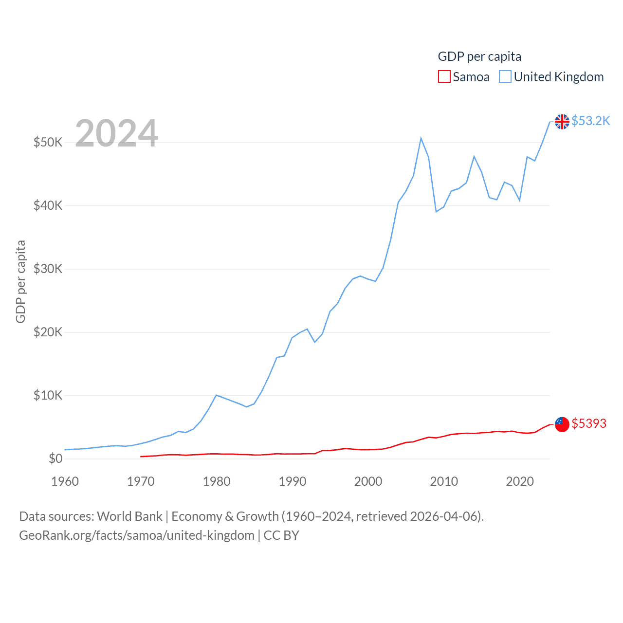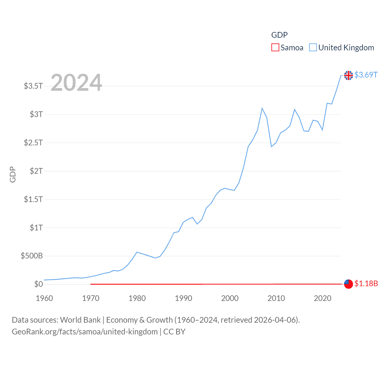 By GDP, Samoa ranks 185/197 ($1.18B) and The United Kingdom ranks 6/197 ($3.69T). By GDP per capita, Samoa ranks 117/197 ($5,393), while The United Kingdom ranks 22/197 ($53,246).