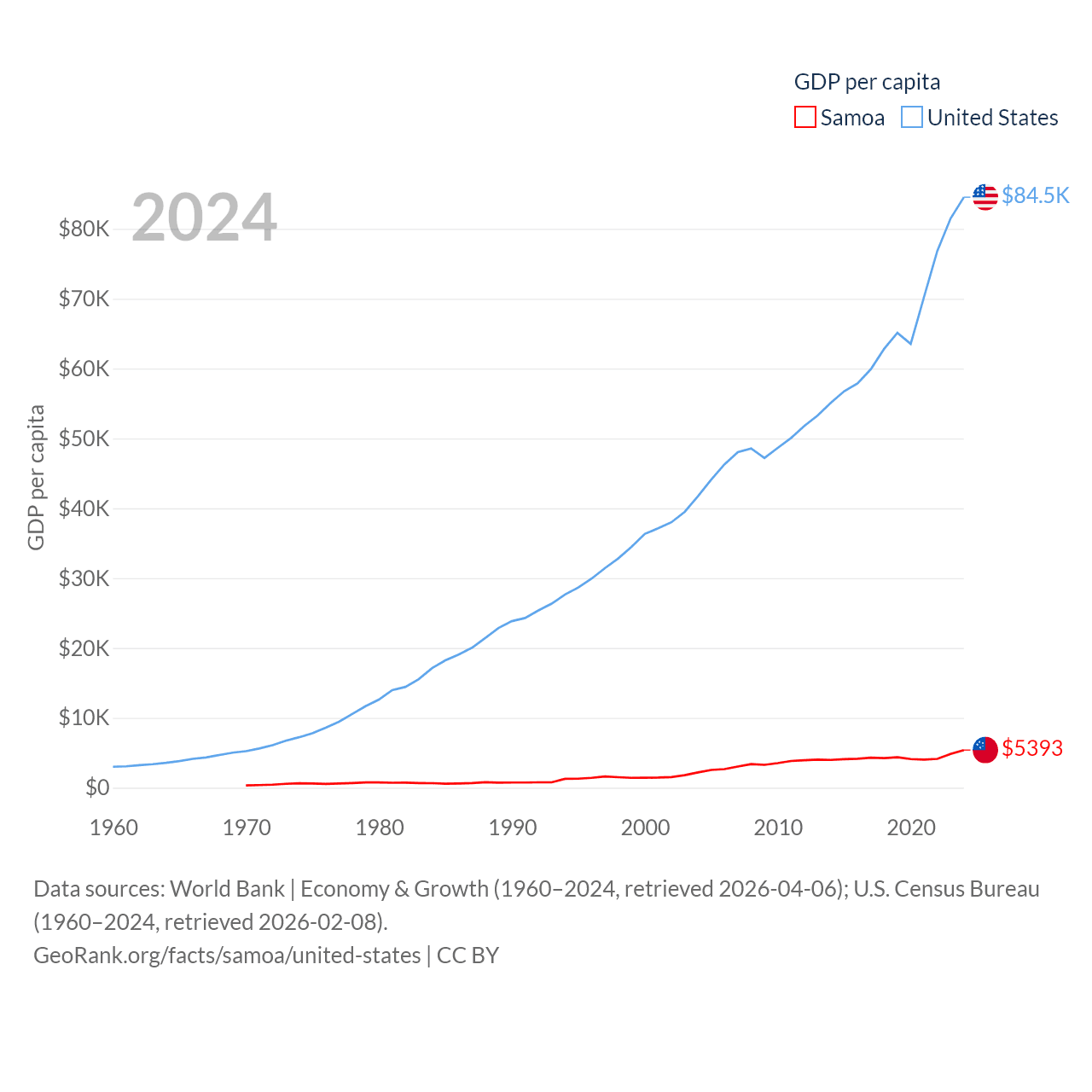 By GDP, Samoa ranks 185/197 ($1.18B) and The United States ranks 1/197 ($28.8T). By GDP per capita, Samoa ranks 117/197 ($5,393), while The United States ranks 10/197 ($84,534).
