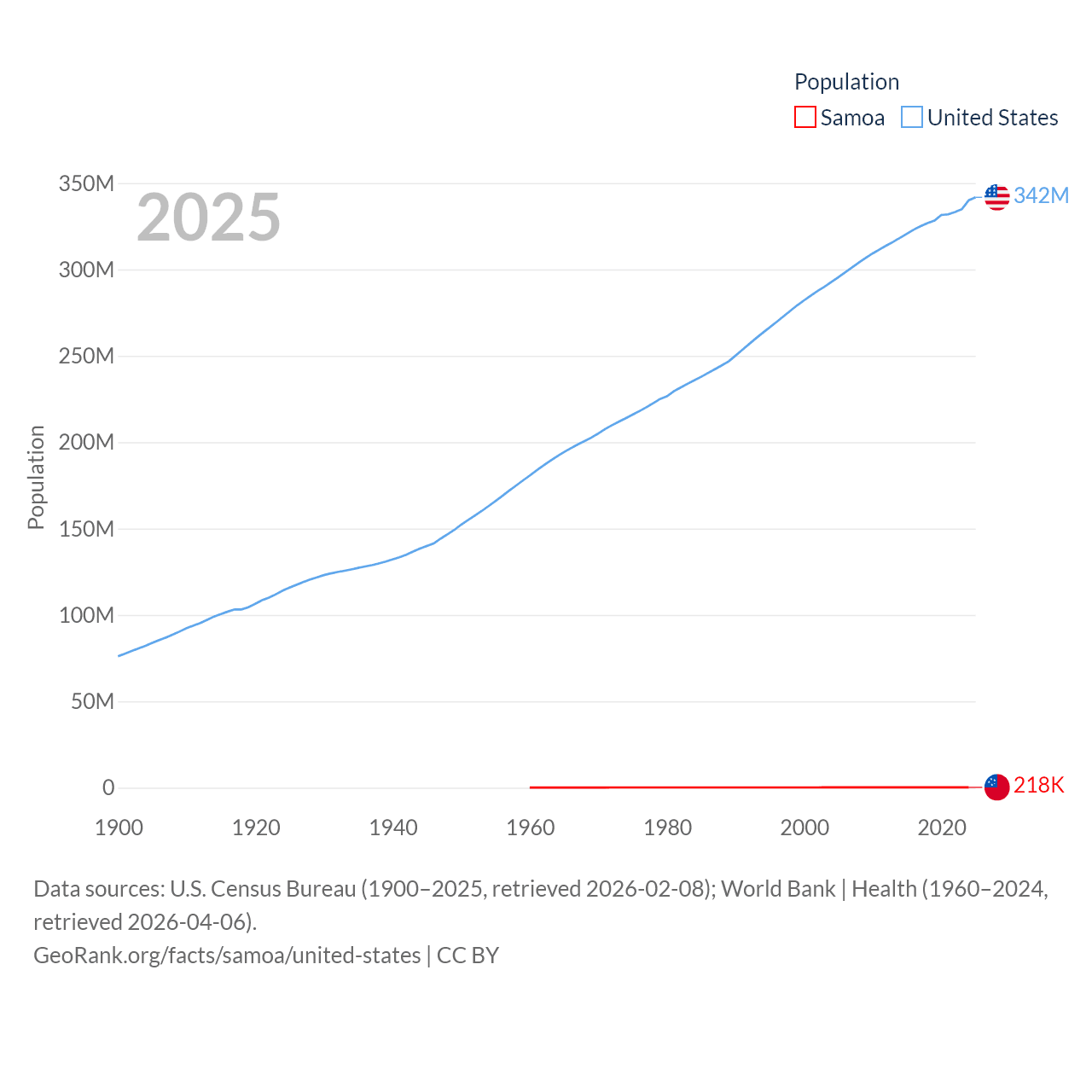 Samoa has a population of 218K (ranked 177/197), compared with 342M in The United States (ranked 3/197). Samoa's land area is 1,073 sq mi versus 3,531,839 sq mi for The United States (ranked 168th vs. 3rd).
