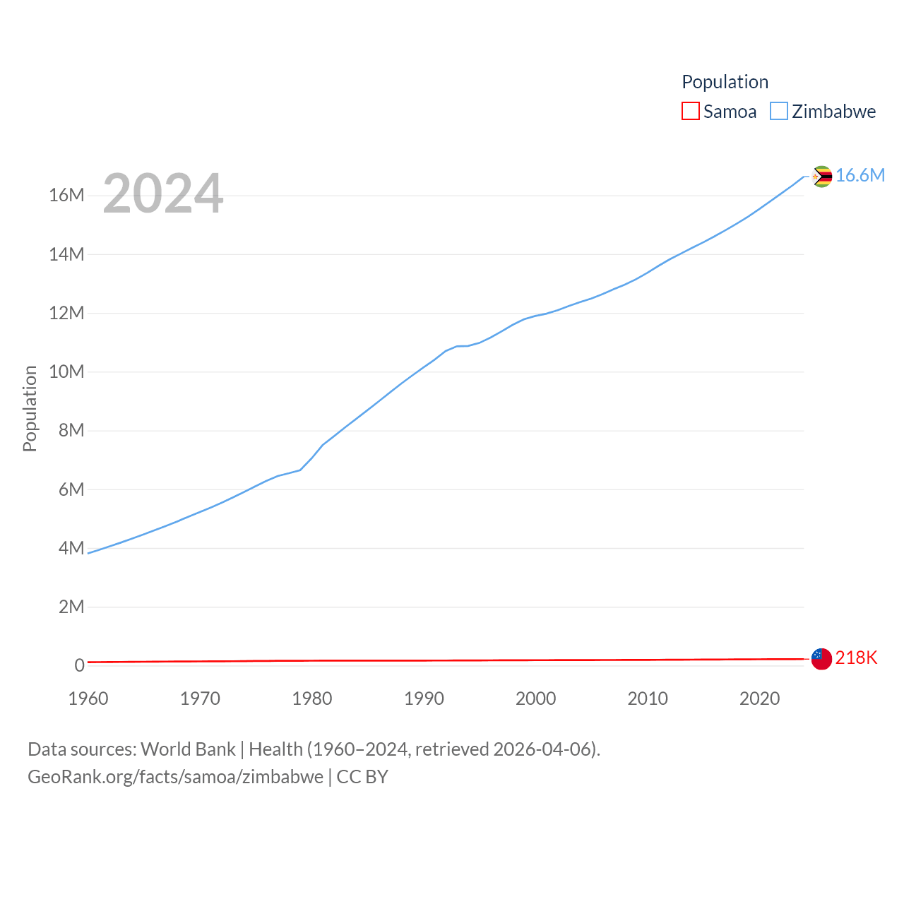 Samoa has a population of 218K (ranked 177/197), compared with 16.6M in Zimbabwe (ranked 74/197). Samoa's land area is 1,073 sq mi versus 149,364 sq mi for Zimbabwe (ranked 168th vs. 60th).