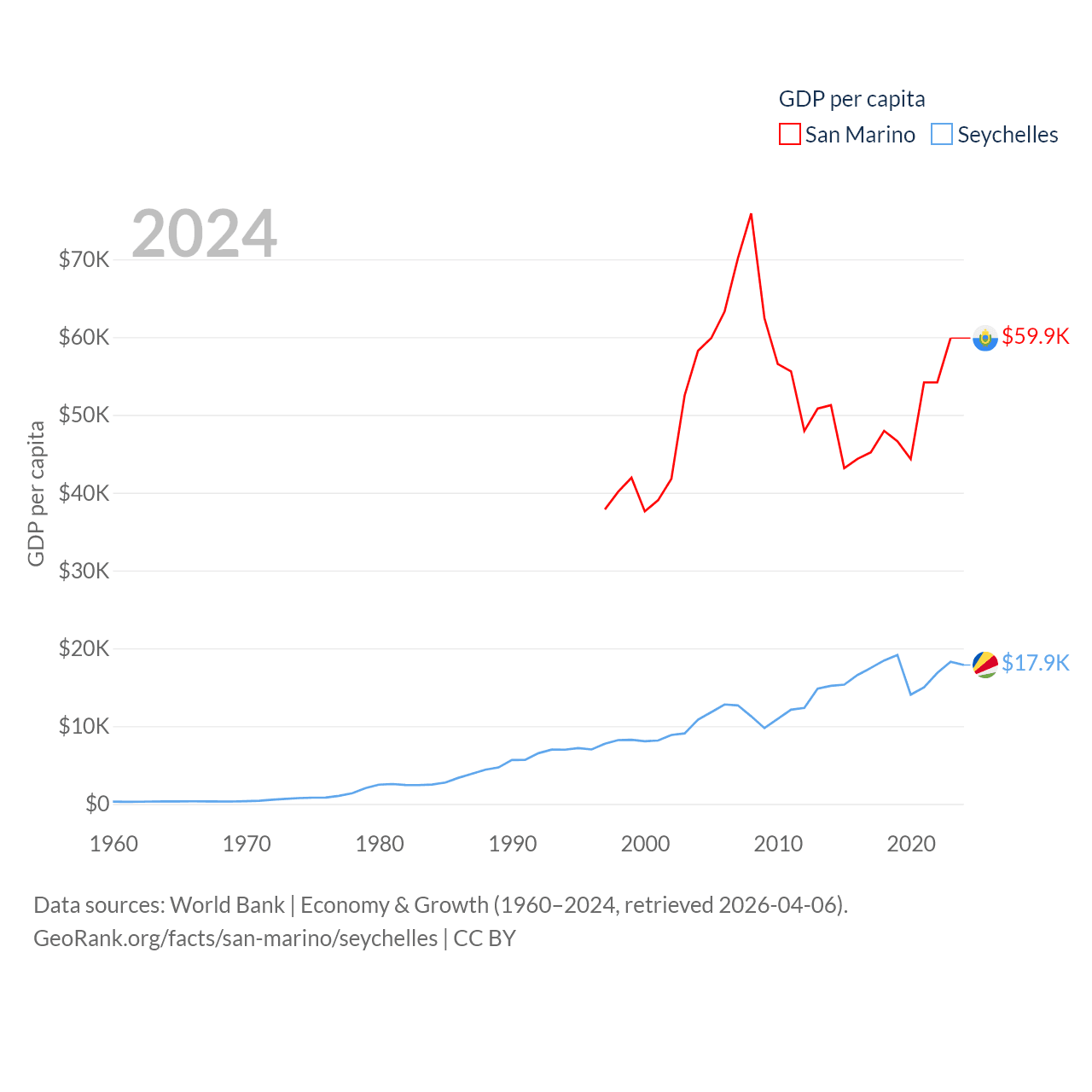 By GDP, San Marino ranks 180/197 ($2.03B) and The Seychelles ranks 178/197 ($2.17B). By GDP per capita, San Marino ranks 15/197 ($59,880), while The Seychelles ranks 63/197 ($17,859).