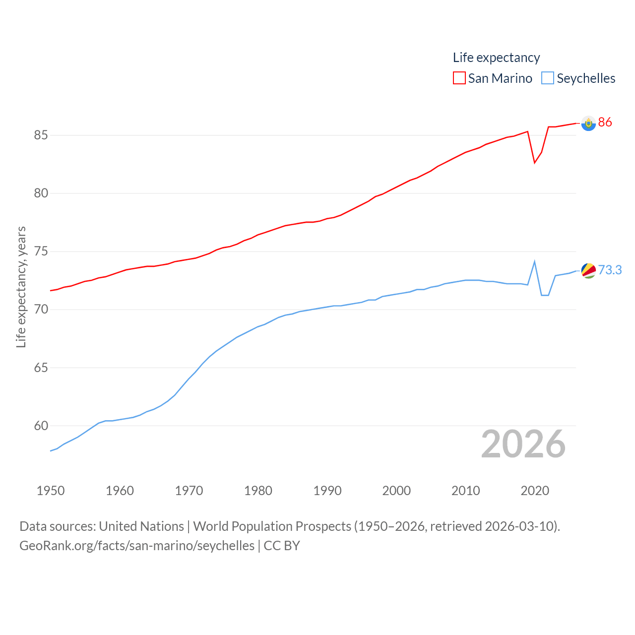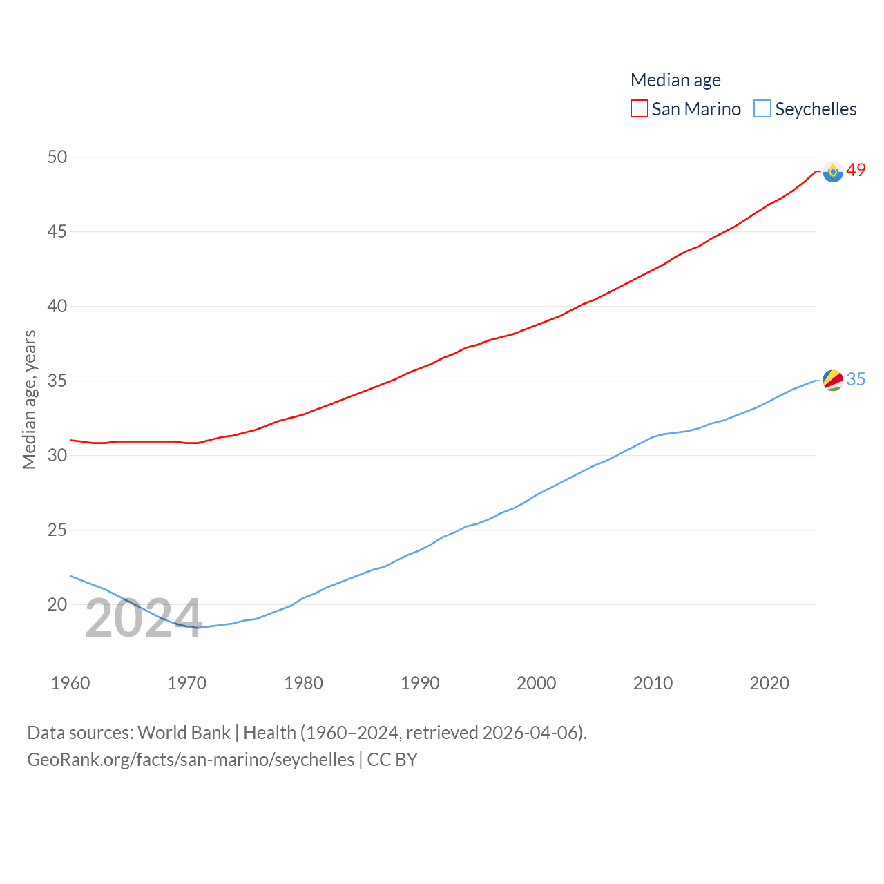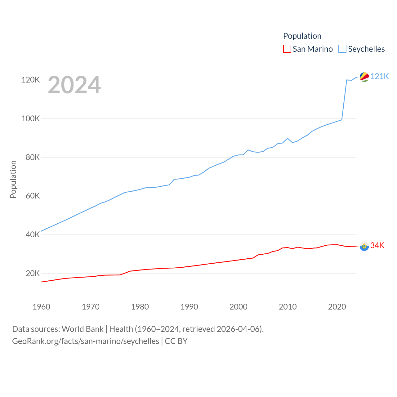 San Marino has a population of 34K (ranked 193/197), compared with 121K in The Seychelles (ranked 181/197). San Marino's land area is 23.2 sq mi versus 177.6 sq mi for The Seychelles (ranked 193rd vs. 181st).
