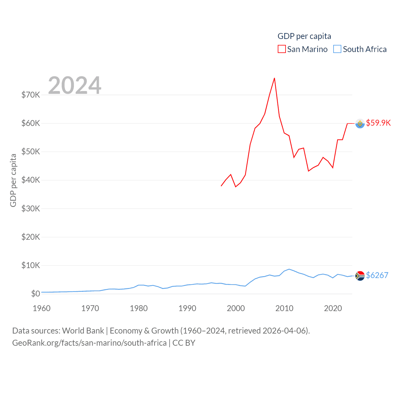 By GDP, San Marino ranks 180/197 ($2.03B) and South Africa ranks 40/197 ($401B). By GDP per capita, San Marino ranks 15/197 ($59,880), while South Africa ranks 111/197 ($6,267).