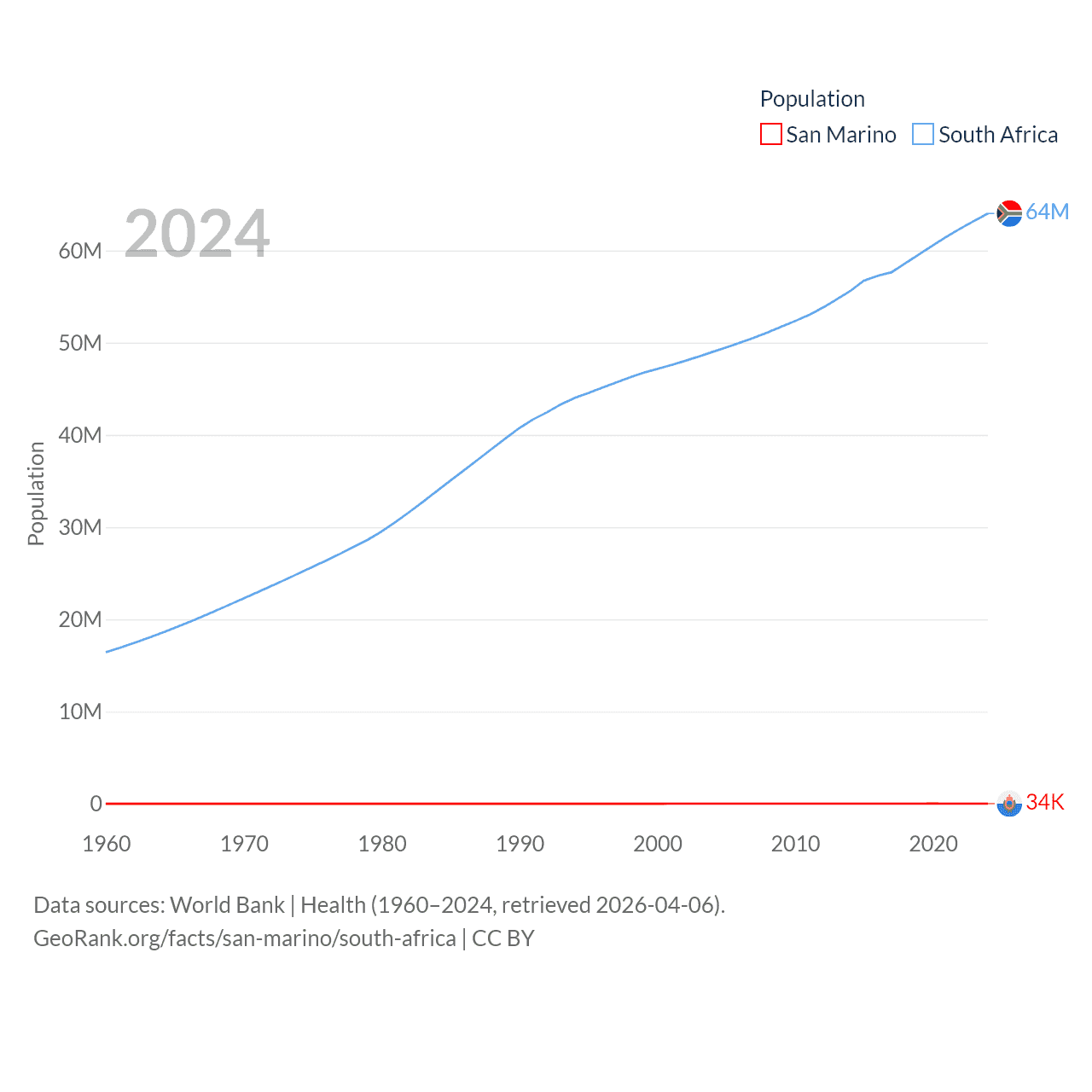 San Marino has a population of 34K (ranked 193/197), compared with 64M in South Africa (ranked 24/197). San Marino's land area is 23.2 sq mi versus 468,377 sq mi for South Africa (ranked 193rd vs. 24th).
