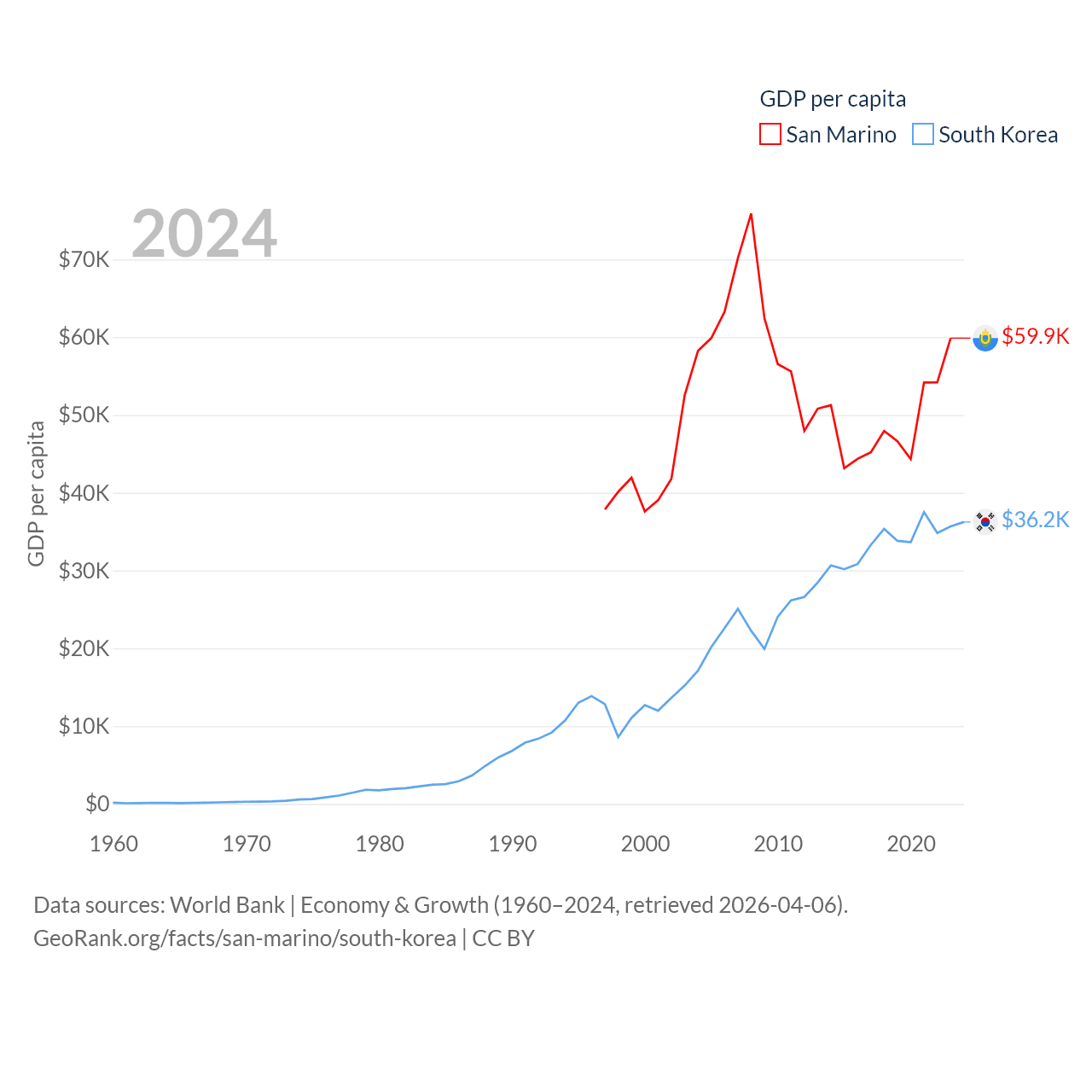 By GDP, San Marino ranks 180/197 ($2.03B) and South Korea ranks 12/197 ($1.88T). By GDP per capita, San Marino ranks 15/197 ($59,880), while South Korea ranks 31/197 ($36,239).