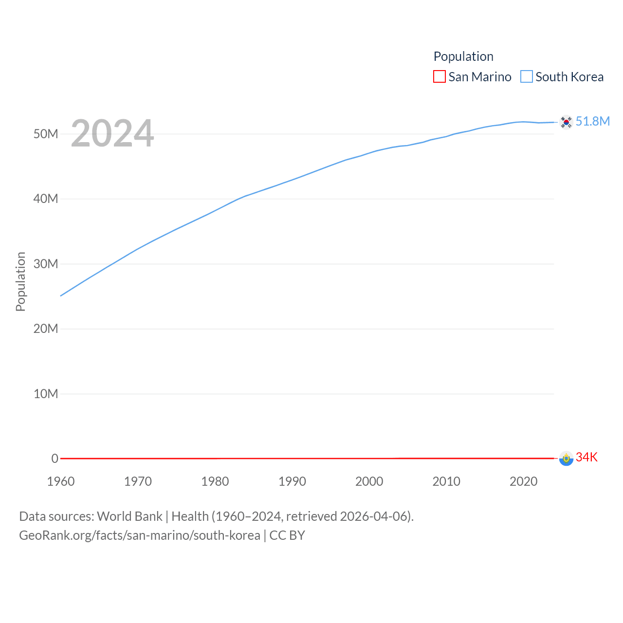 San Marino has a population of 34K (ranked 193/197), compared with 51.8M in South Korea (ranked 29/197). San Marino's land area is 23.2 sq mi versus 37,684 sq mi for South Korea (ranked 193rd vs. 105th).