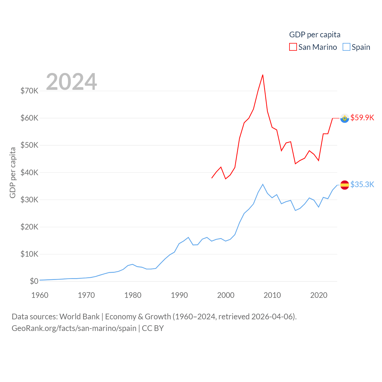 By GDP, San Marino ranks 180/197 ($2.03B) and Spain ranks 15/197 ($1.73T). By GDP per capita, San Marino ranks 15/197 ($59,880), while Spain ranks 32/197 ($35,327).