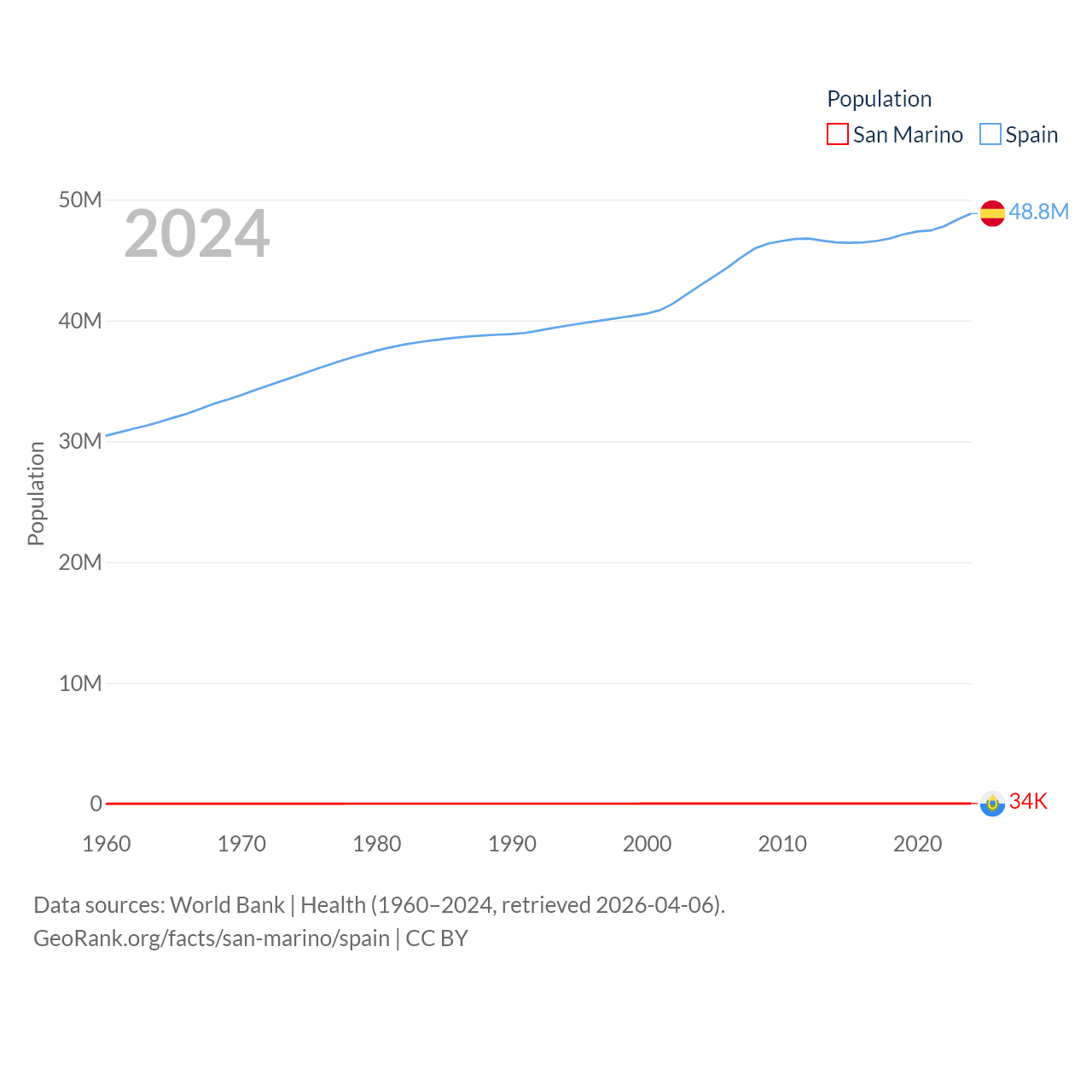 San Marino has a population of 34K (ranked 193/197), compared with 48.8M in Spain (ranked 32/197). San Marino's land area is 23.2 sq mi versus 192,934 sq mi for Spain (ranked 193rd vs. 51st).