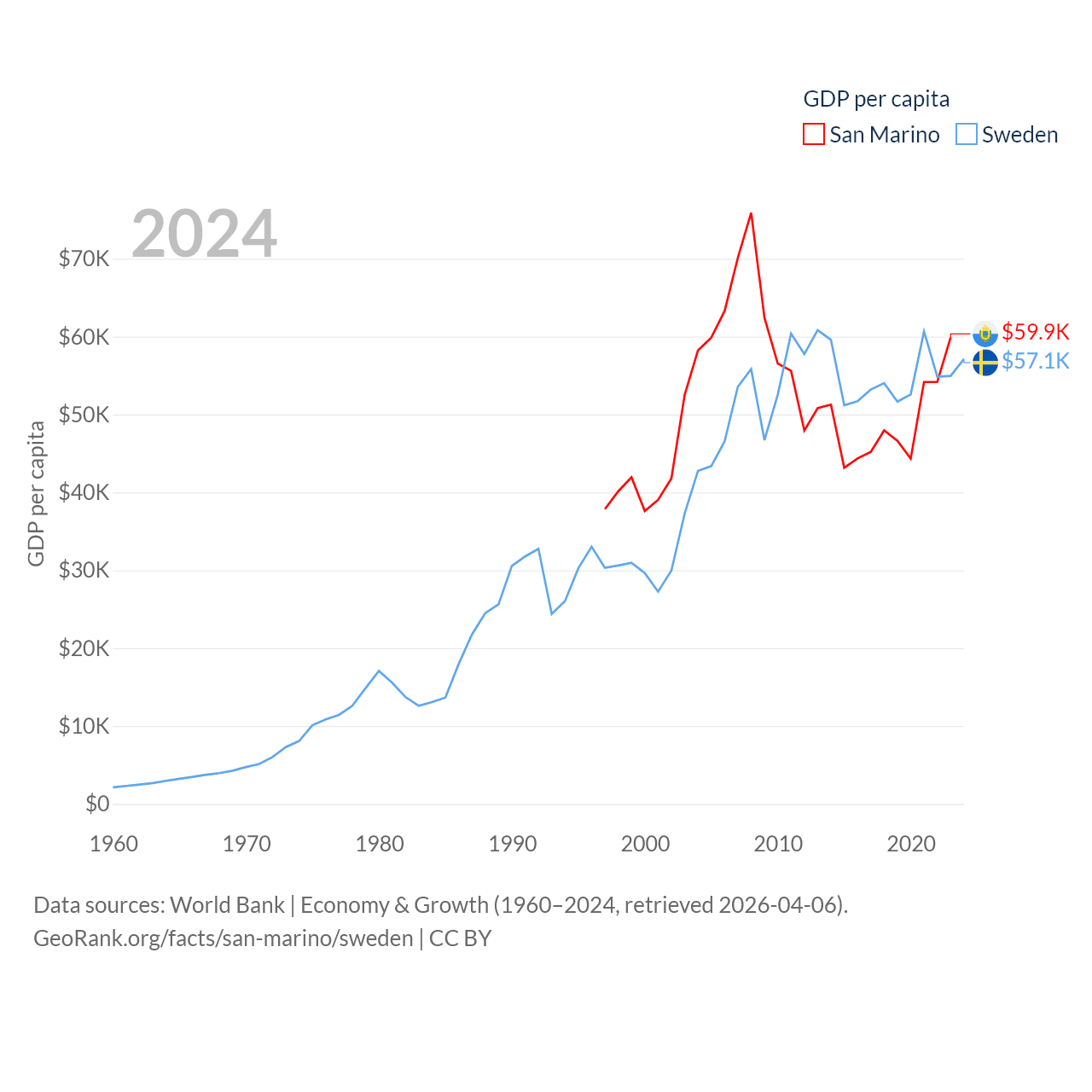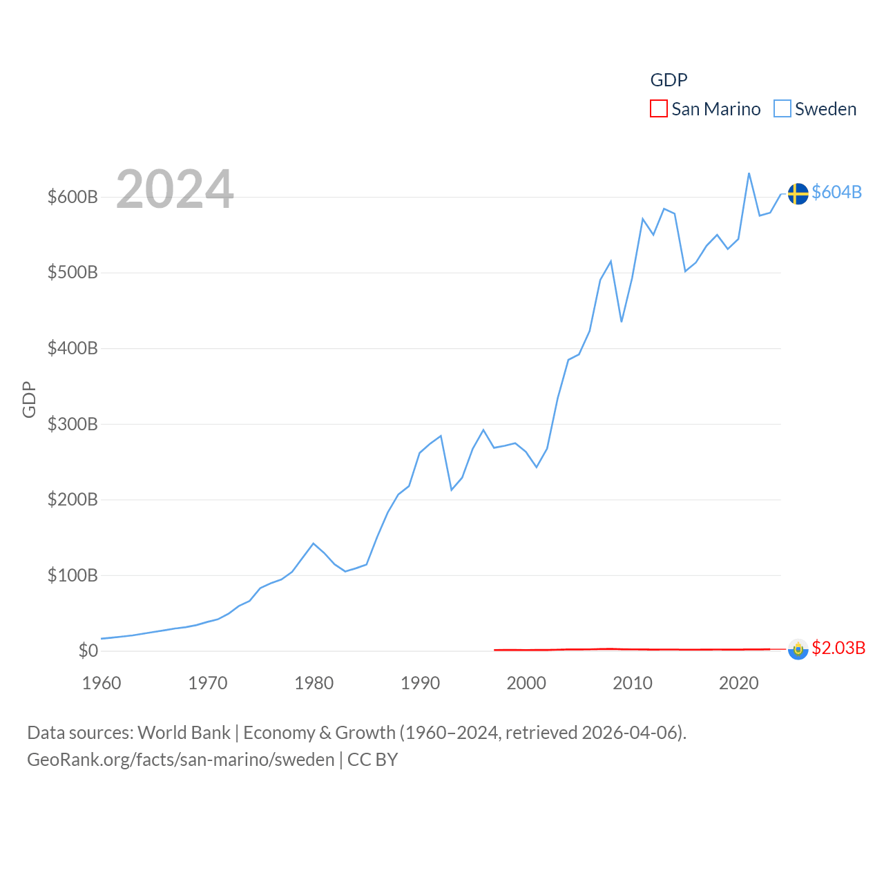 By GDP, San Marino ranks 180/197 ($2.03B) and Sweden ranks 26/197 ($604B). By GDP per capita, San Marino ranks 15/197 ($59,880), while Sweden ranks 17/197 ($57,117).